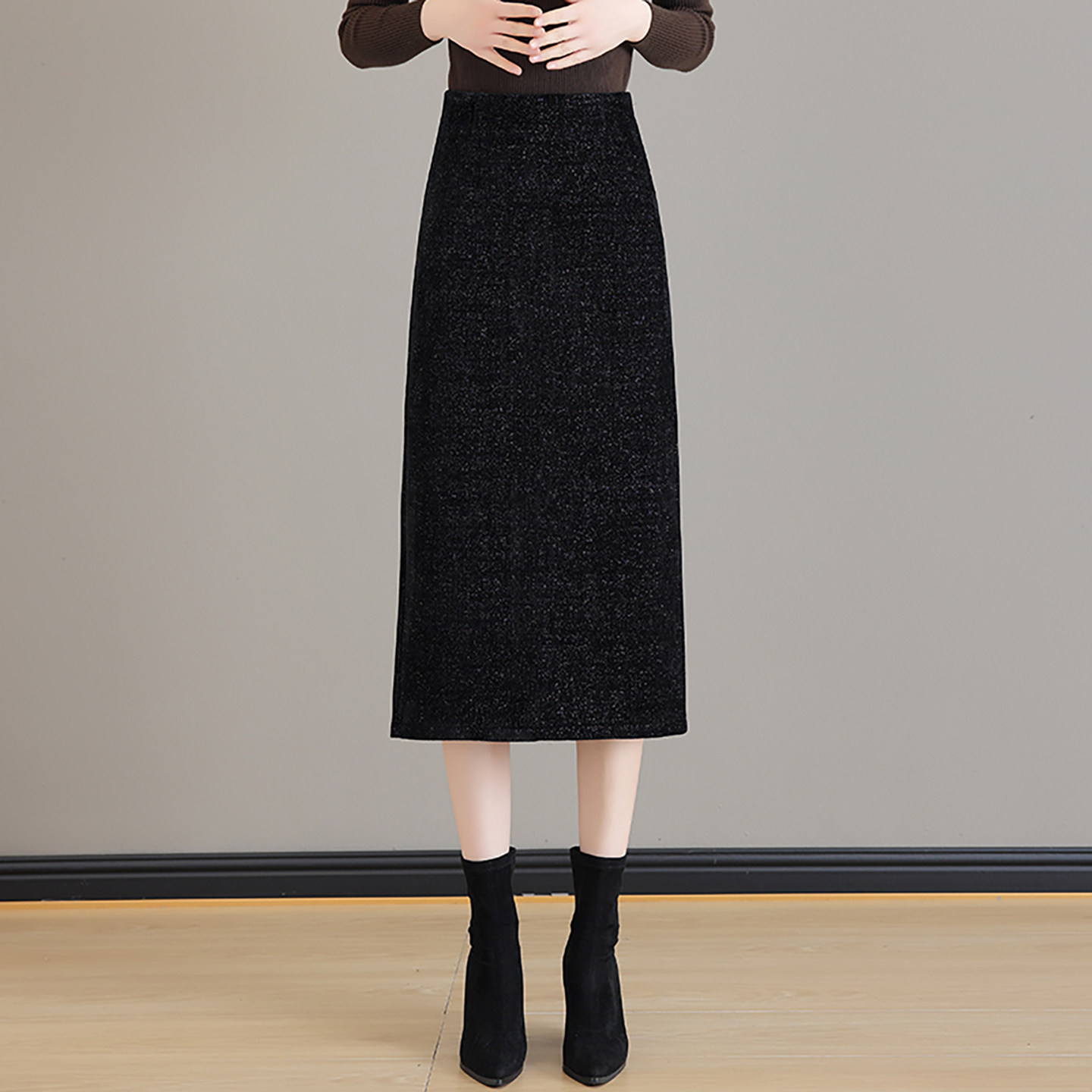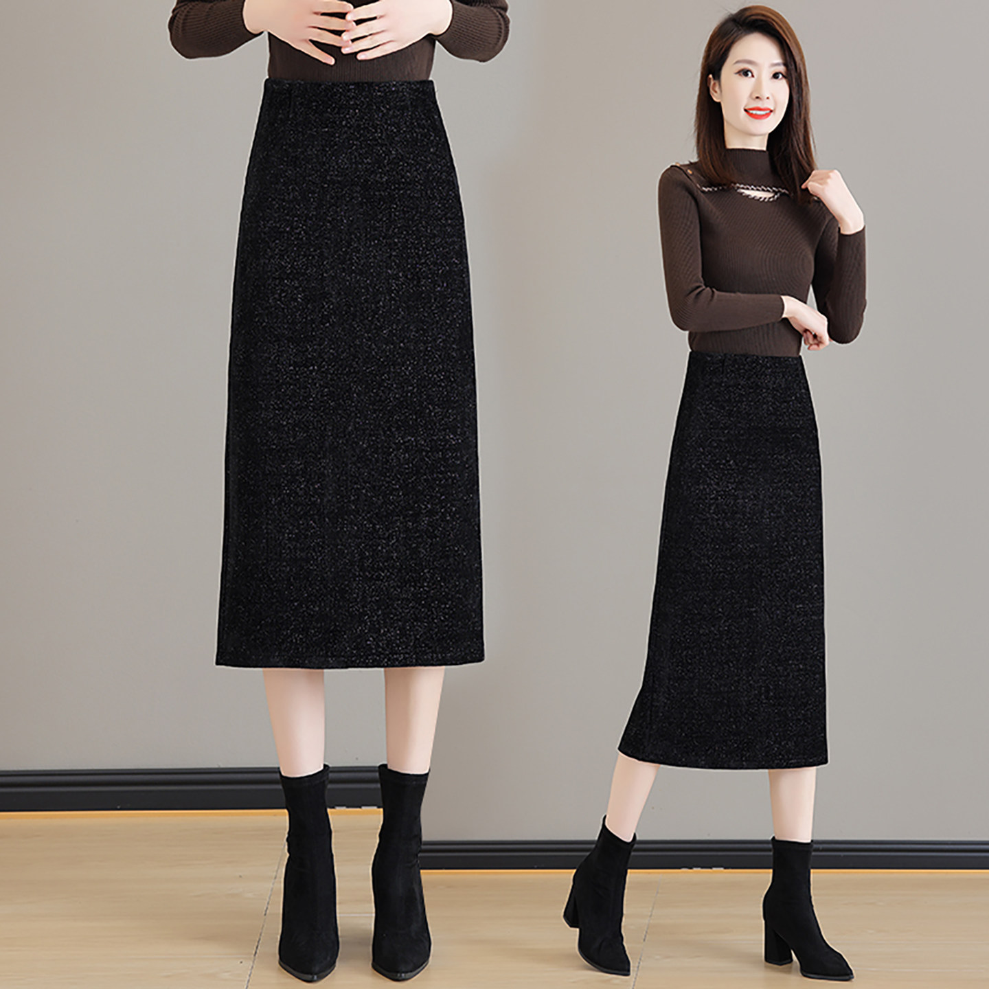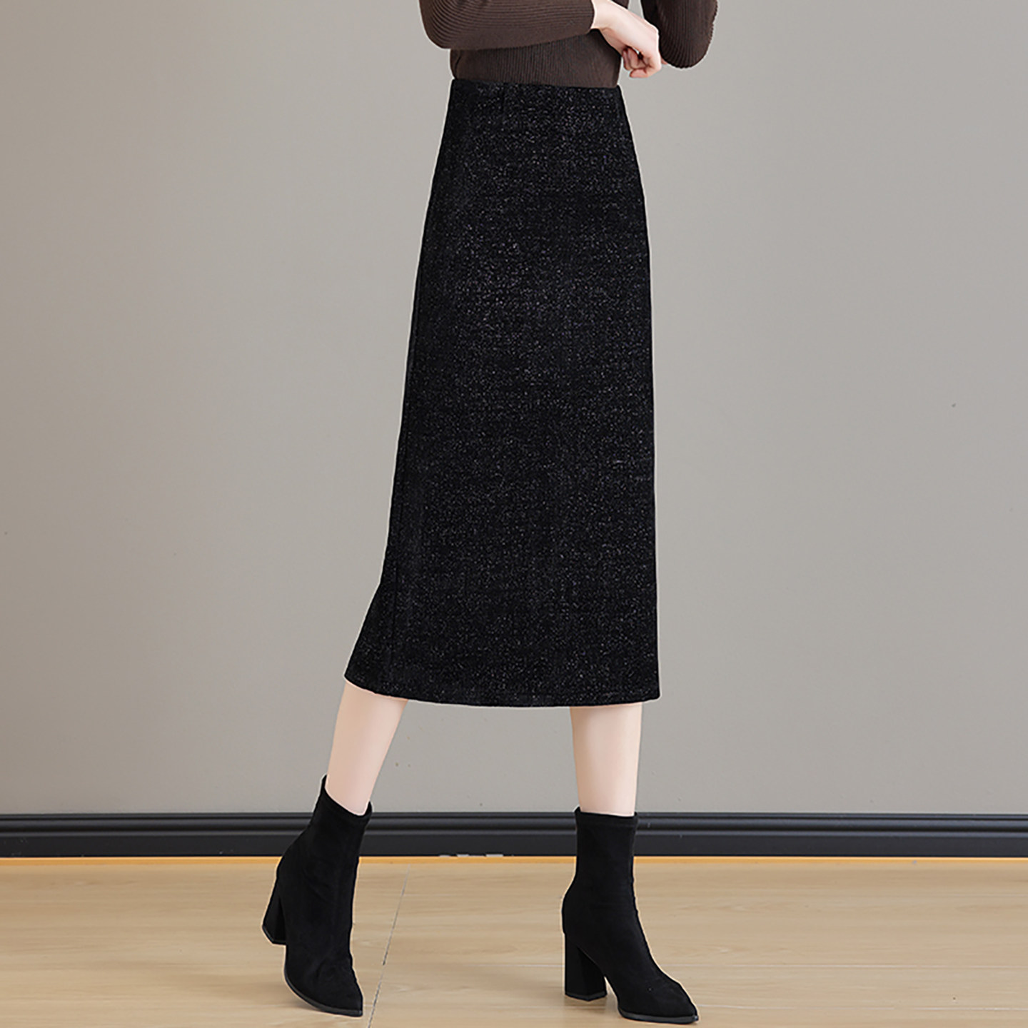 黑色小香风半身裙女2025秋冬季新款高腰亮片中长款开叉一步包臀裙