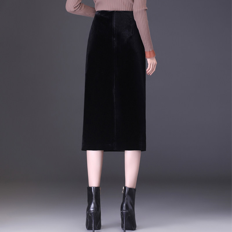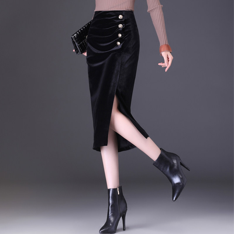 首页> 女装> 黑色金丝绒包臀半身裙女2025秋冬新款高腰显瘦开叉中长款一步裙子