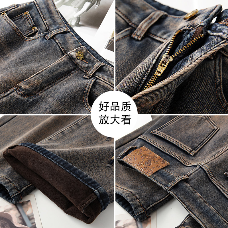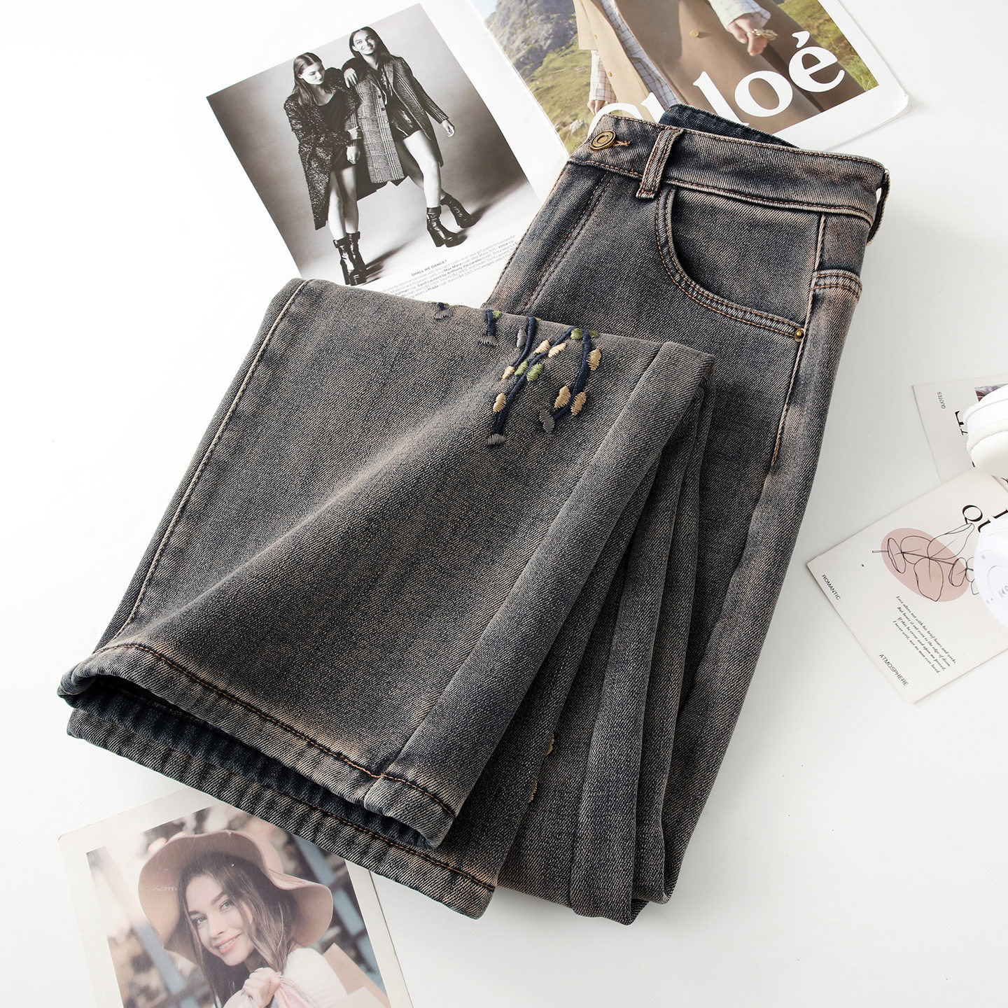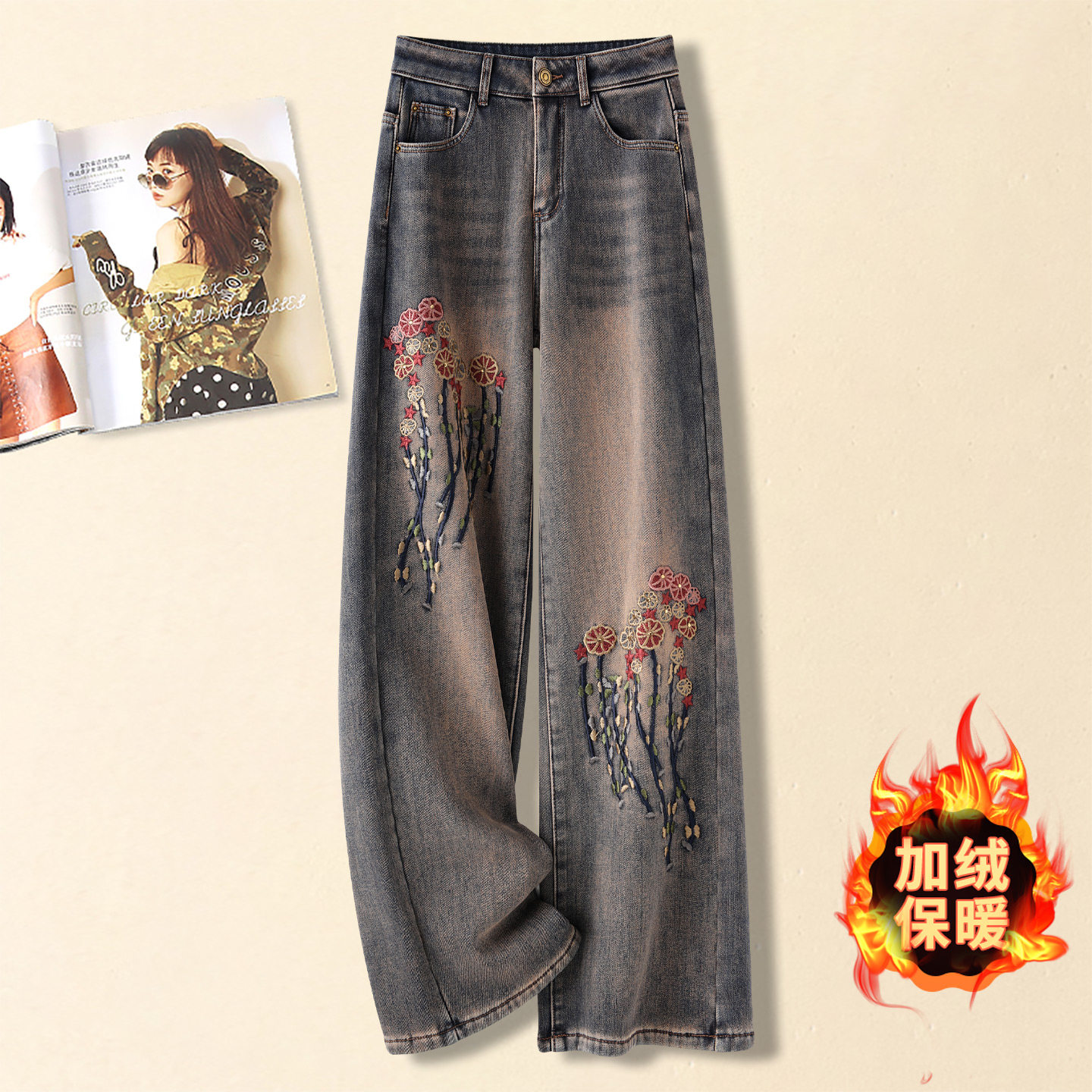 首页> 女装> 啄木鸟复古国风绣花阔腿牛仔裤女秋冬季新款加绒加厚高腰直筒裤子
