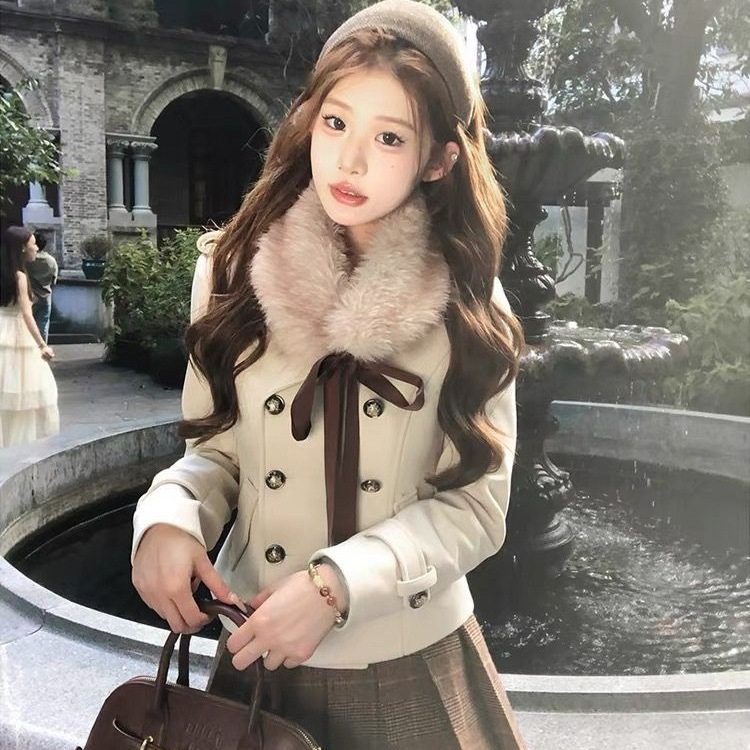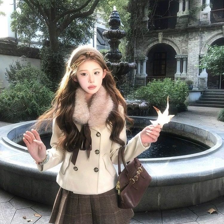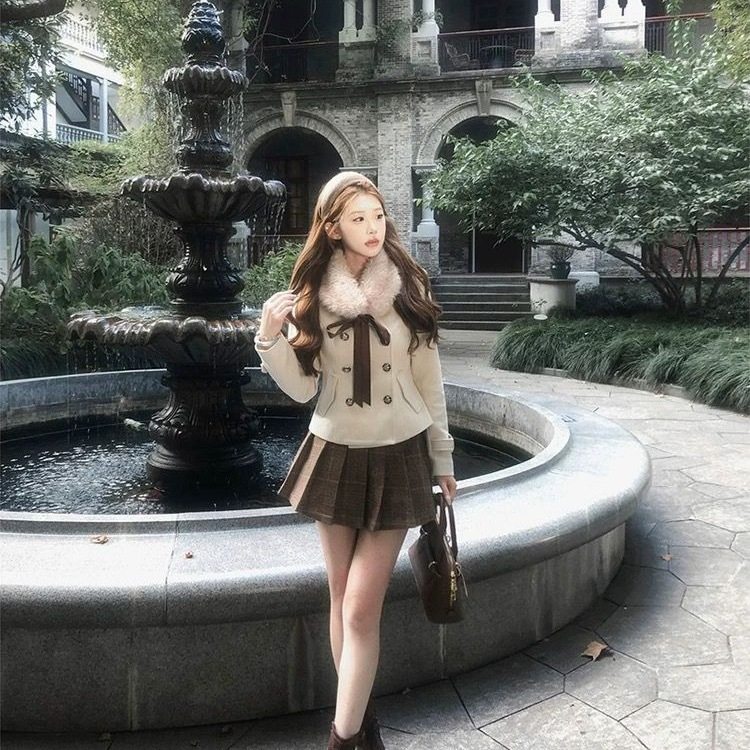 秋冬新款气质英伦风感套装小香风双排扣外套高腰百褶裙两件套