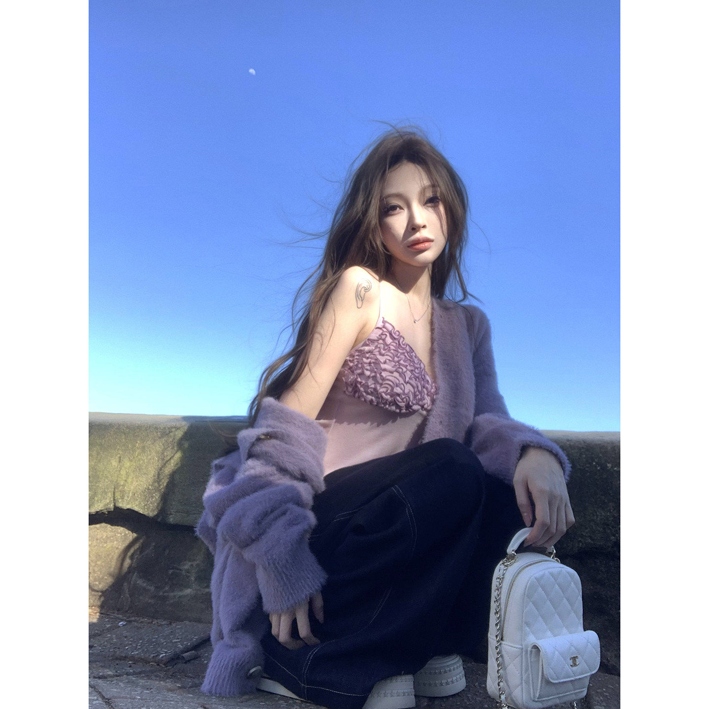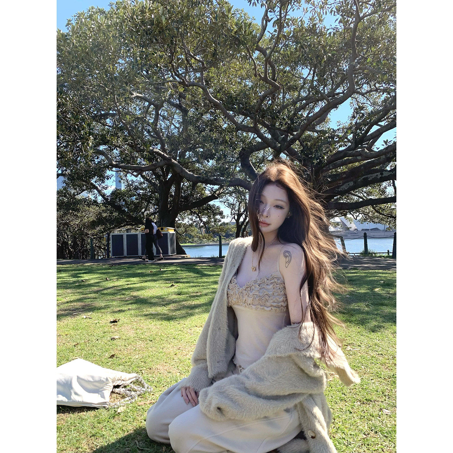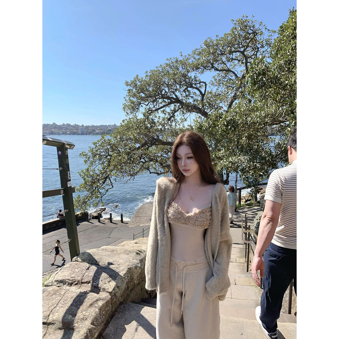Suuuicee 铃兰香颂 纯欲宽松仿水貂毛连帽毛衣外套花边吊带两件套