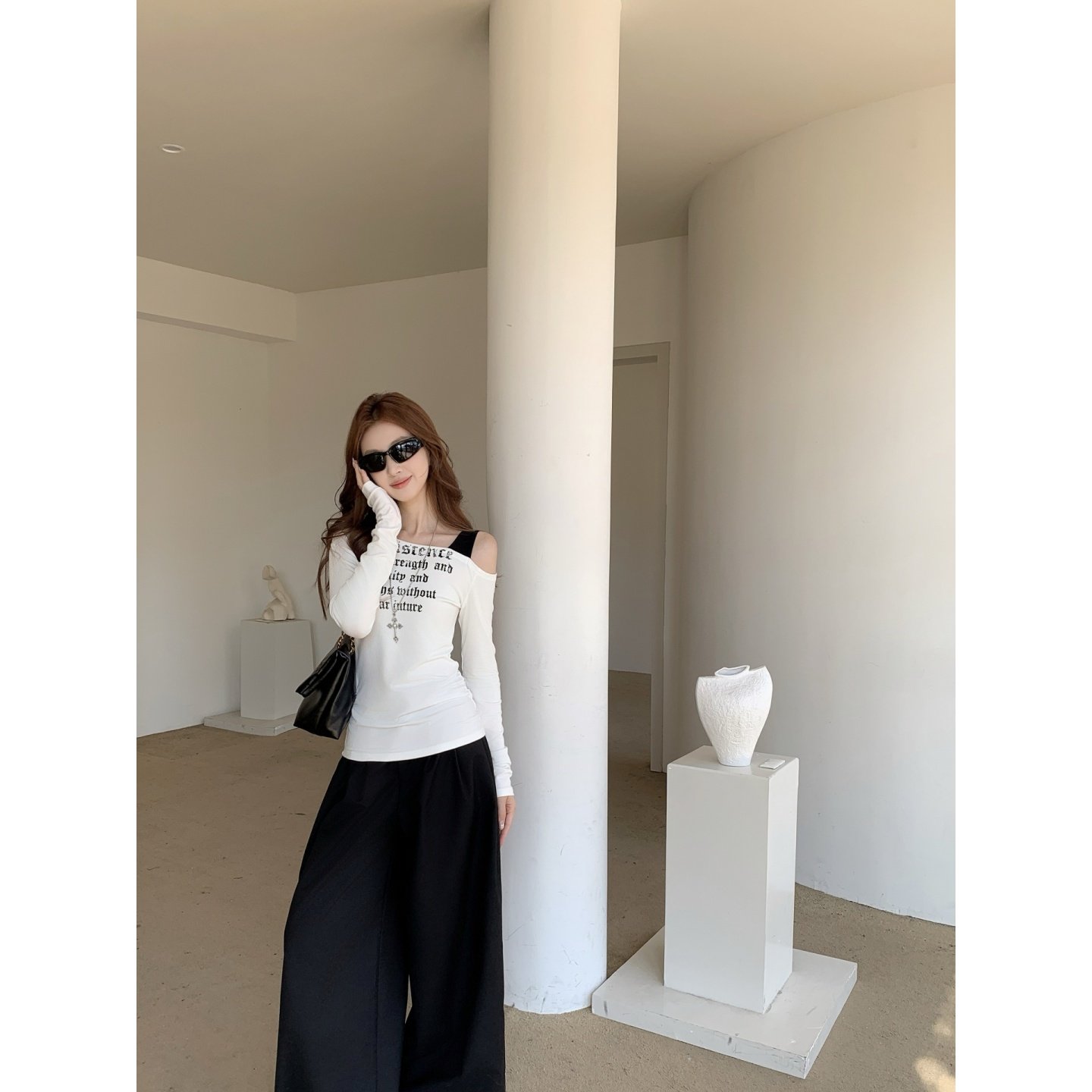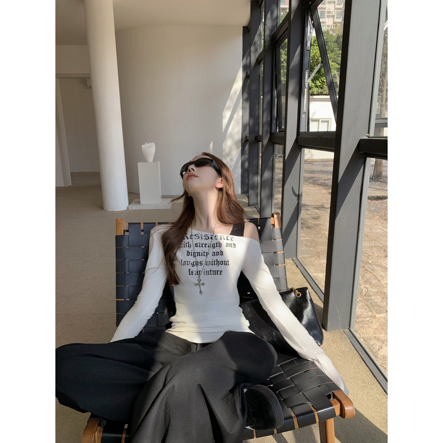 铅笔莓莓【寒素冷飒】美式字母印花斜肩长袖T恤女春辣妹修身上衣