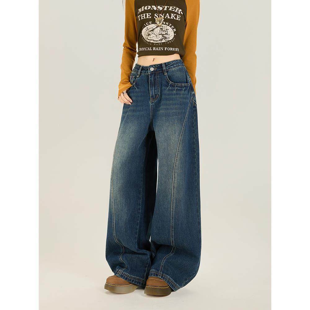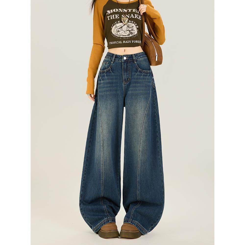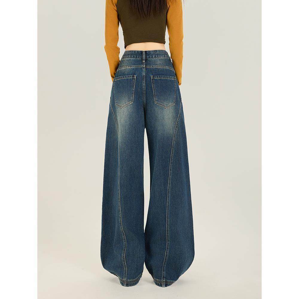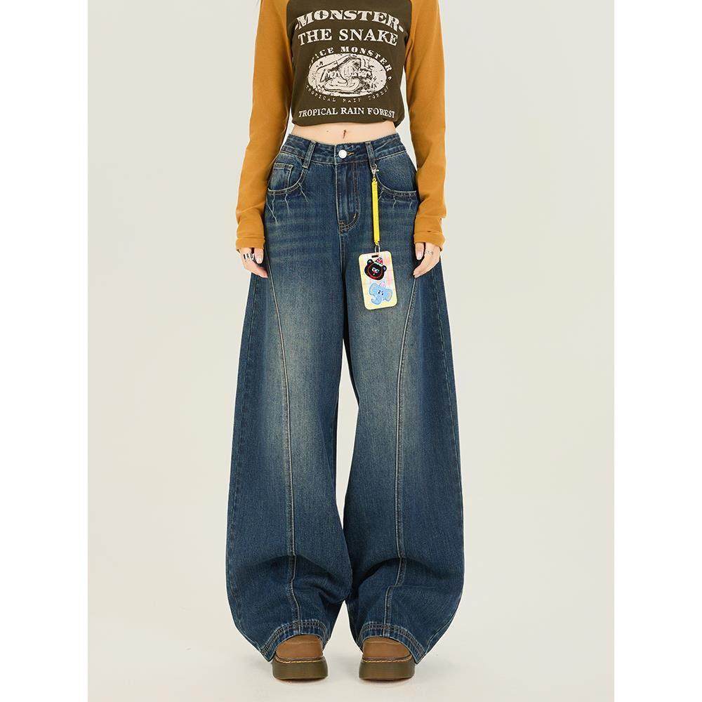 美式弯刀阔腿牛仔裤女春秋新款复古直筒宽松香蕉裤设计感拖地裤子