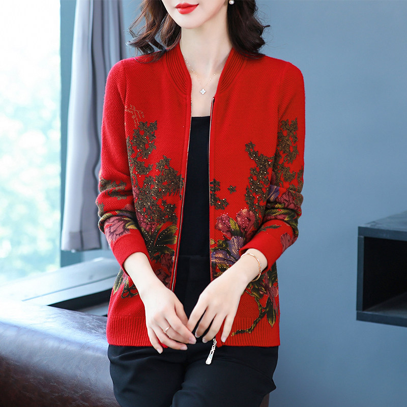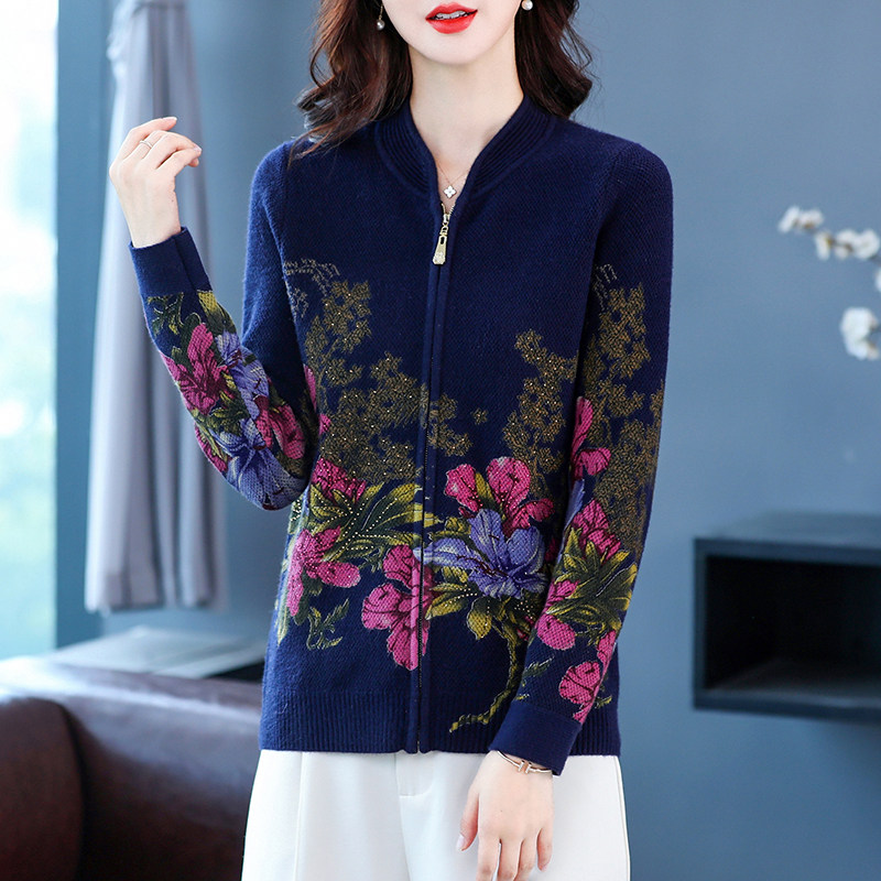 通勤风拉链印花针织开衫女长袖宽松外搭毛衣外套