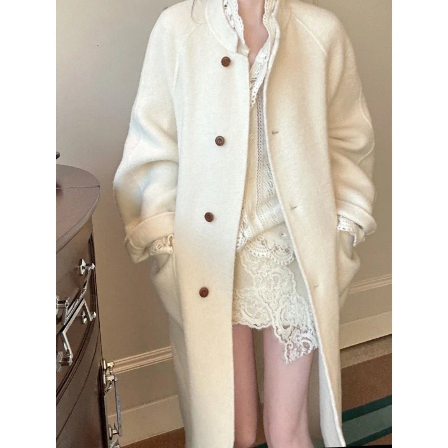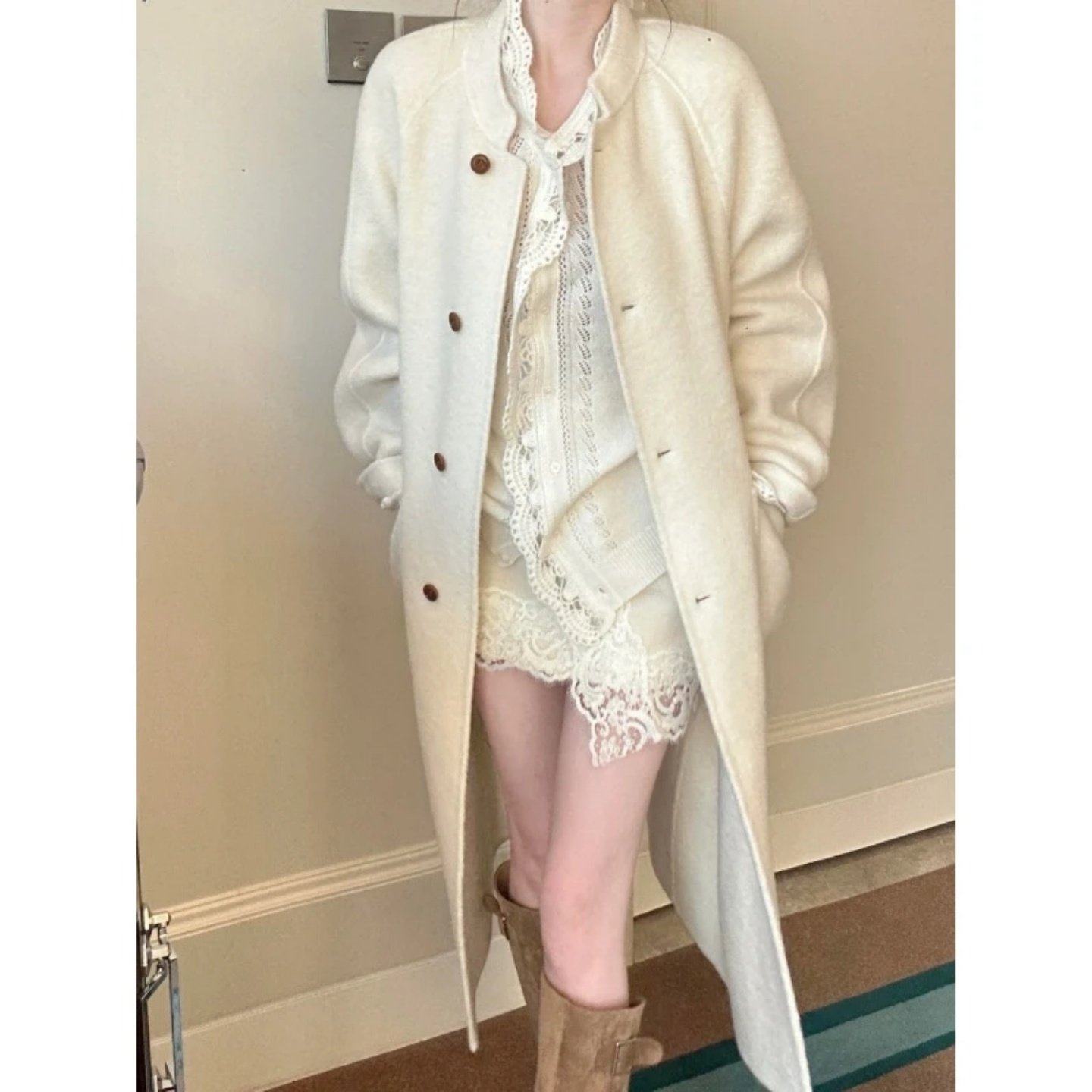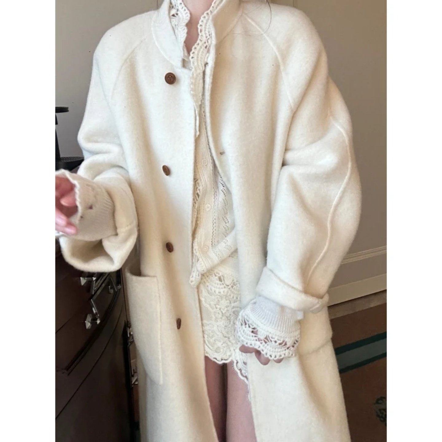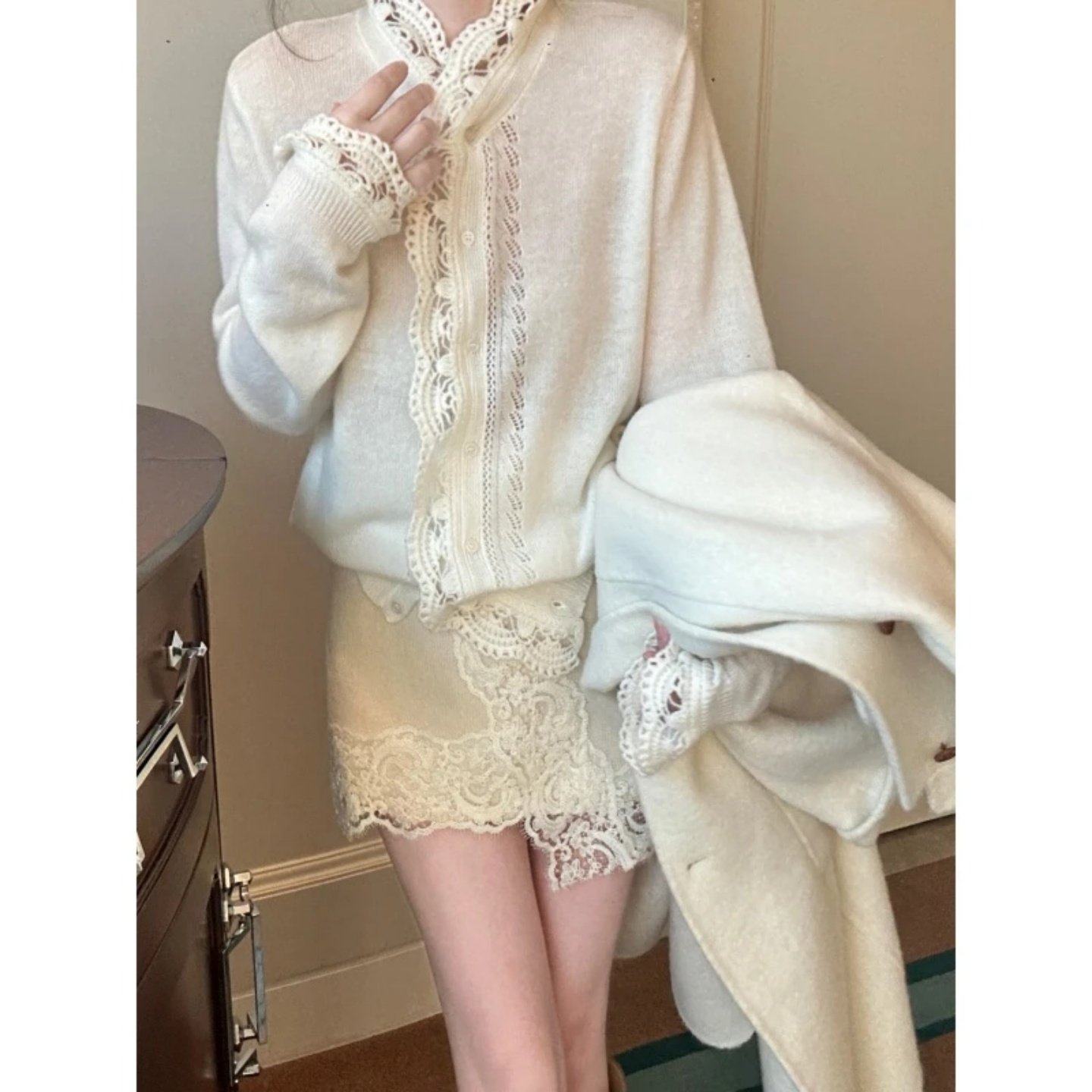 首页> 女装> 2026巨好看搭配一整套蕾丝拼接设计感针织开衫毛呢外套显瘦包臀裙