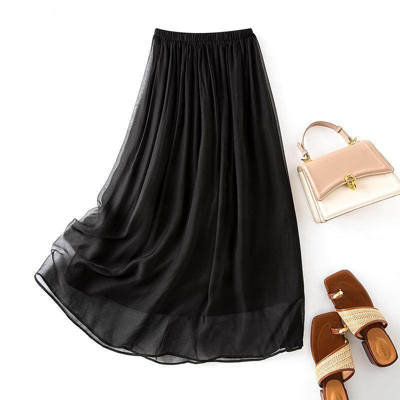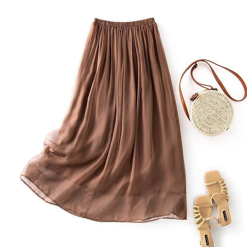 实拍松紧腰真丝半身裙女夏季新款中长款气质松紧腰纯色飘逸裙8506