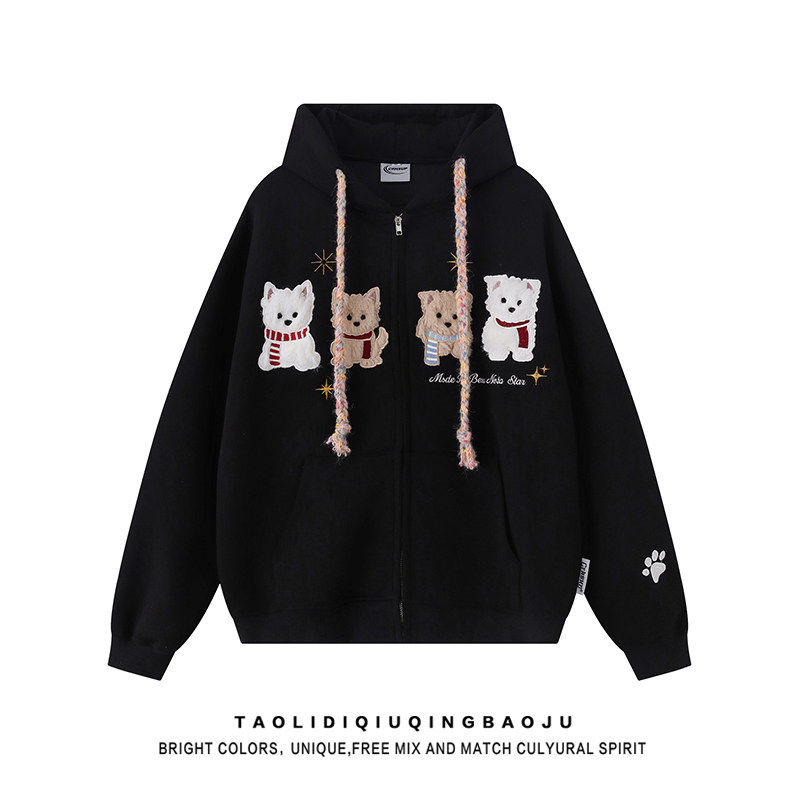 美式覆古毛绒小狗连帽卫衣女2025新款休闲百搭灰色慵懒风开衫外套