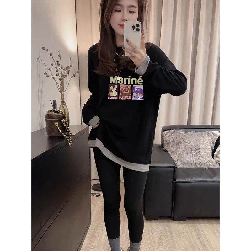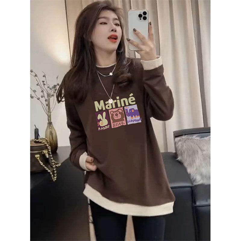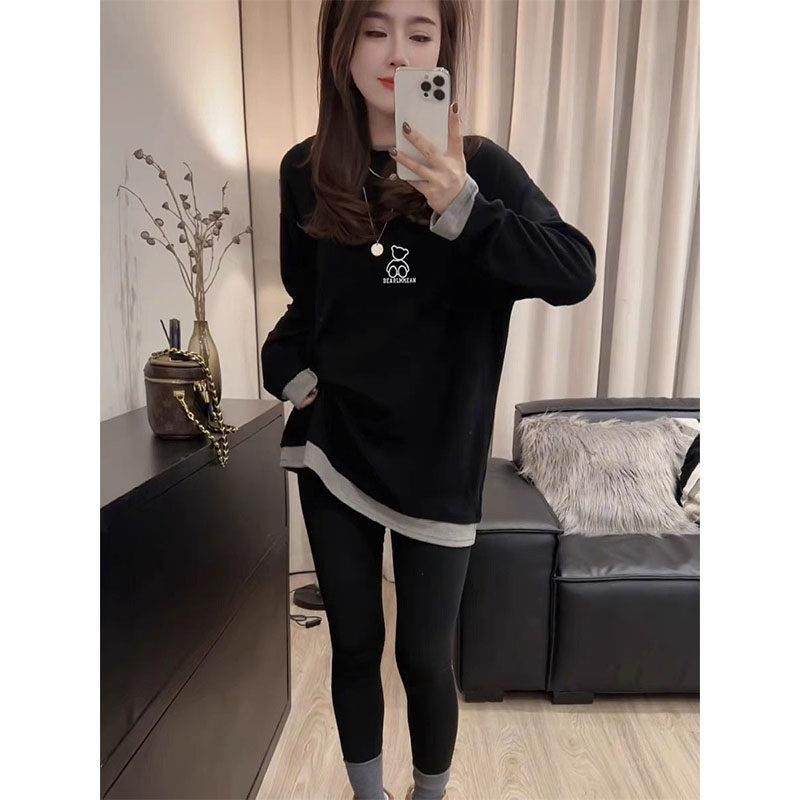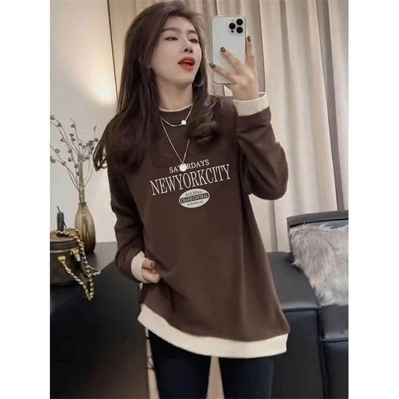 假两件设计感德绒磨毛长袖T恤女中长版加厚保暖打底衫上衣秋冬季