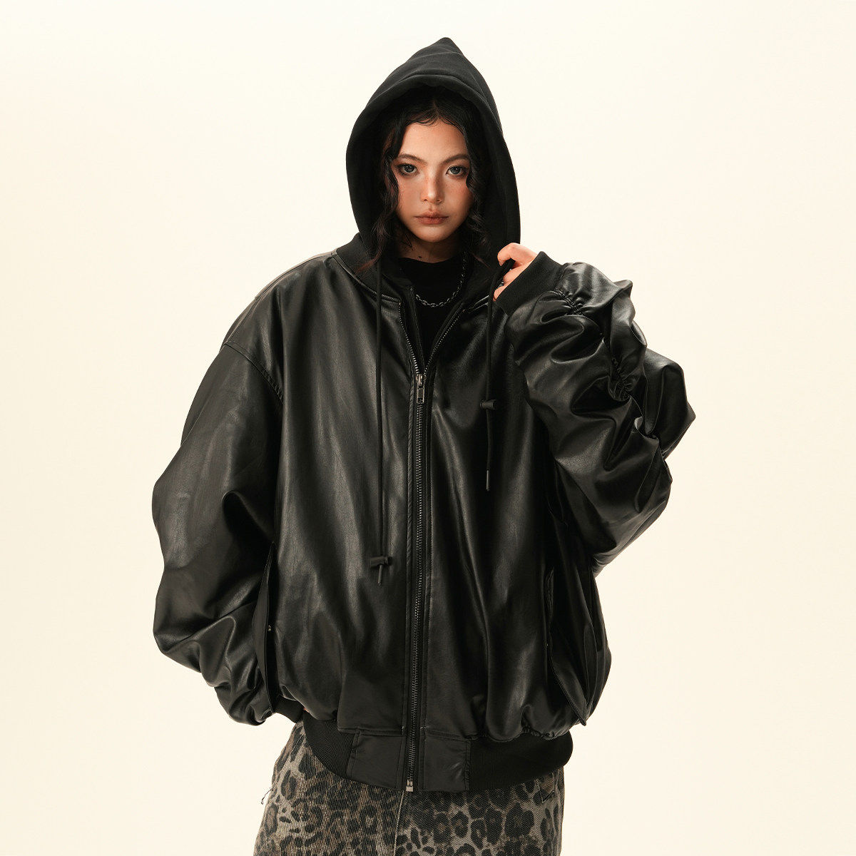 BWKA美式重磅假两件pu皮夹克女男春季潮牌宽松加厚bomber上衣外套
