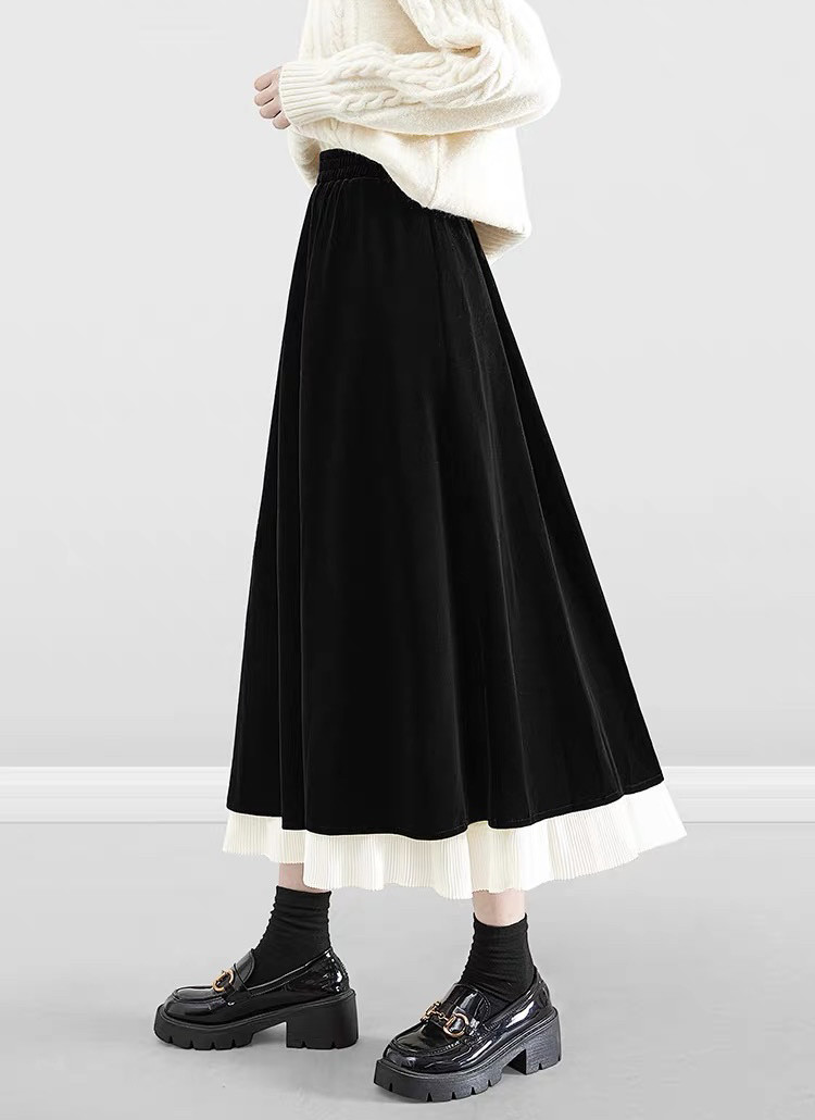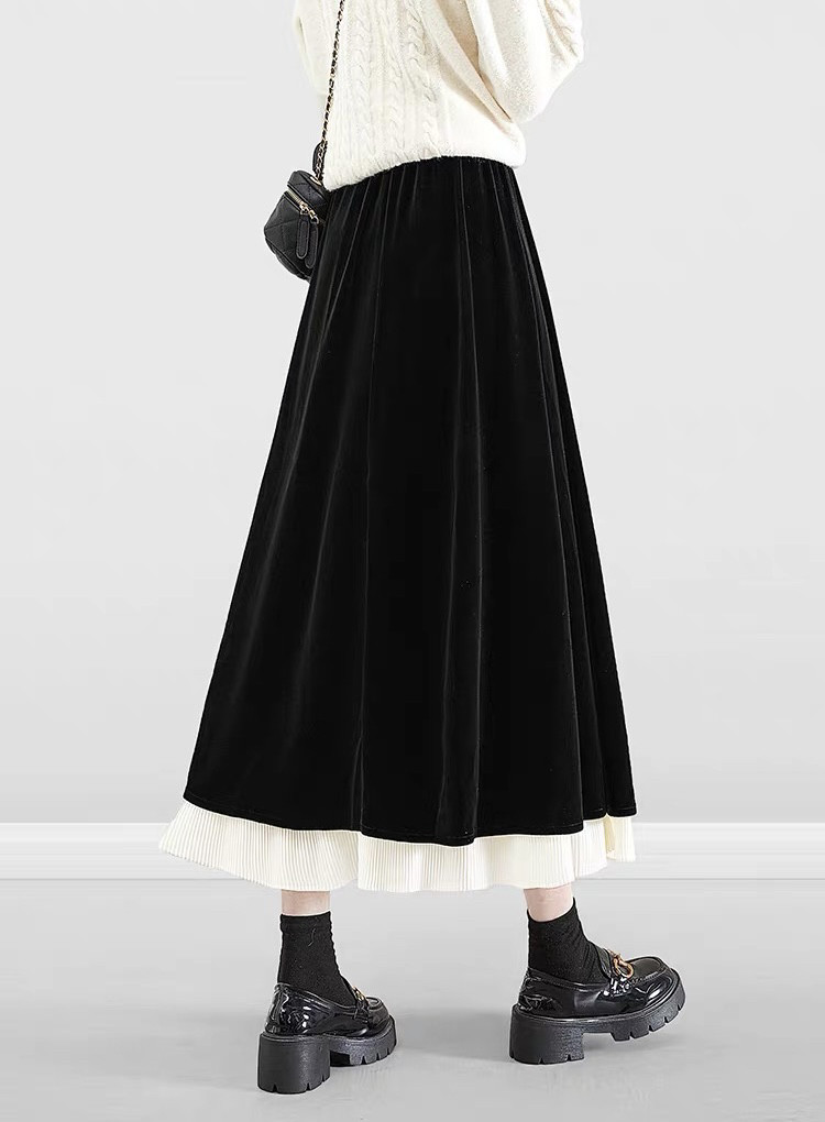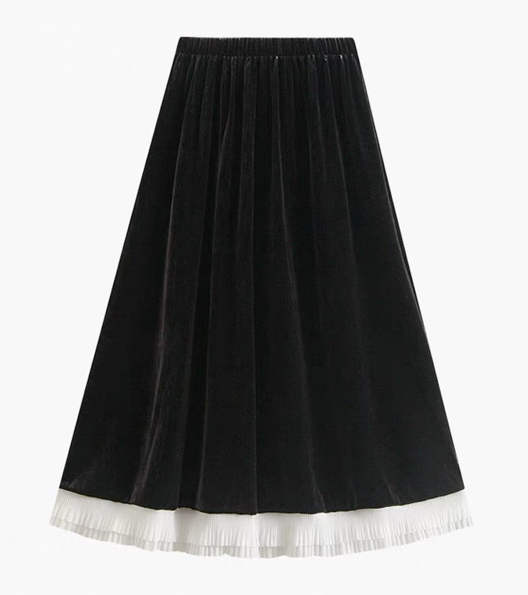 秋冬丝绒半身裙春季新款优雅高腰撞色松紧腰纯色拼接花边裙中长裙