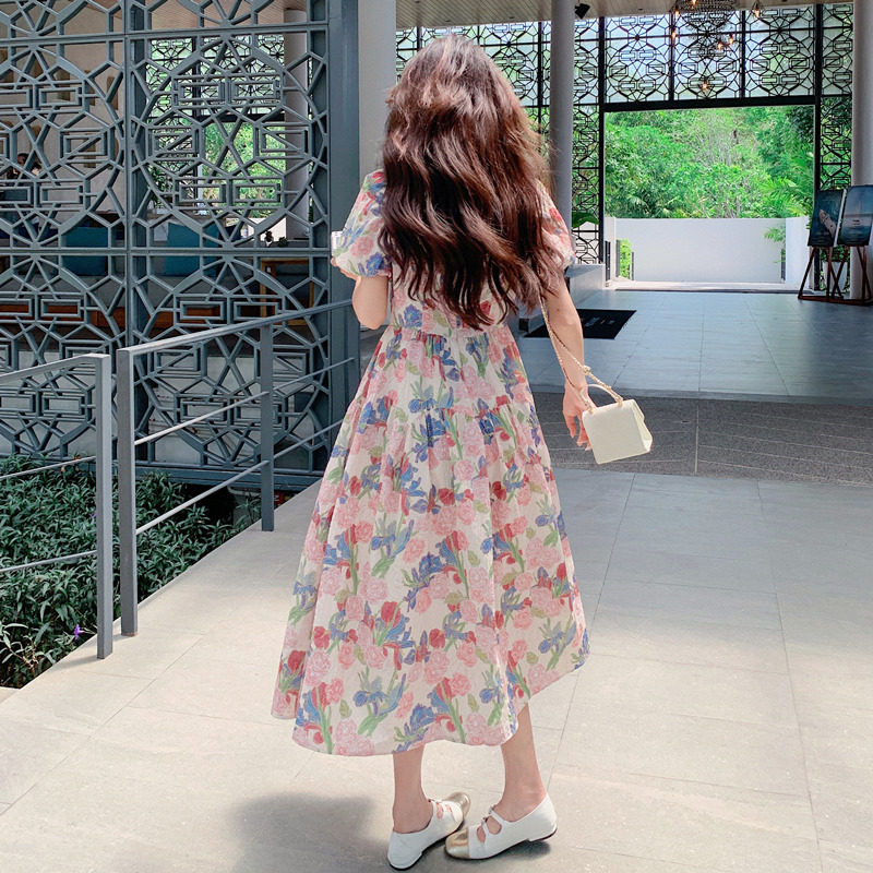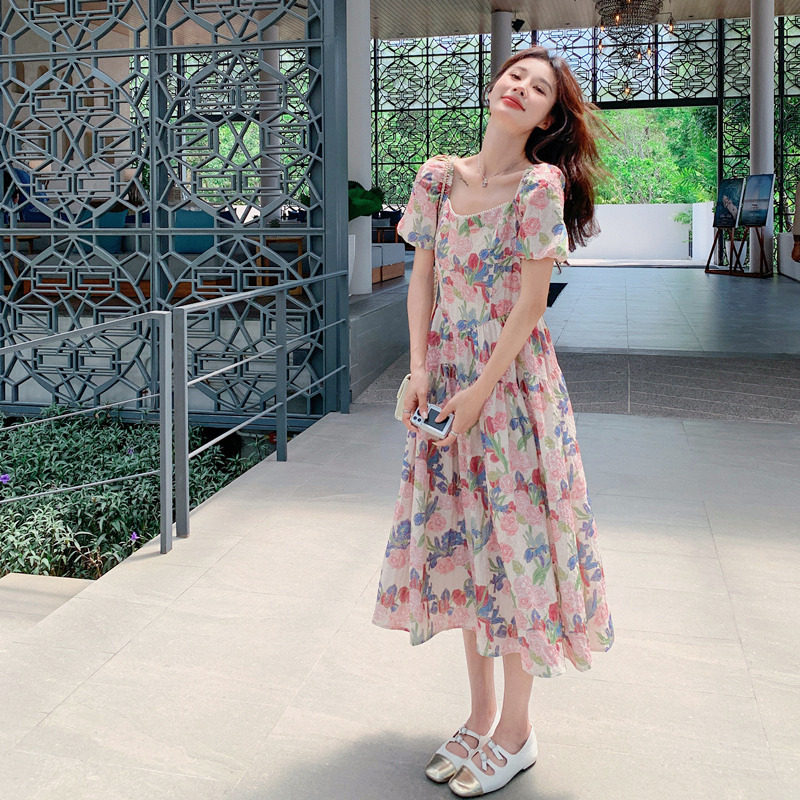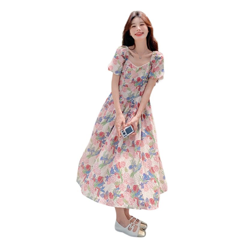 多巴胺法式泡泡袖油画印花方领碎花连衣裙女夏收腰显瘦气质温柔风