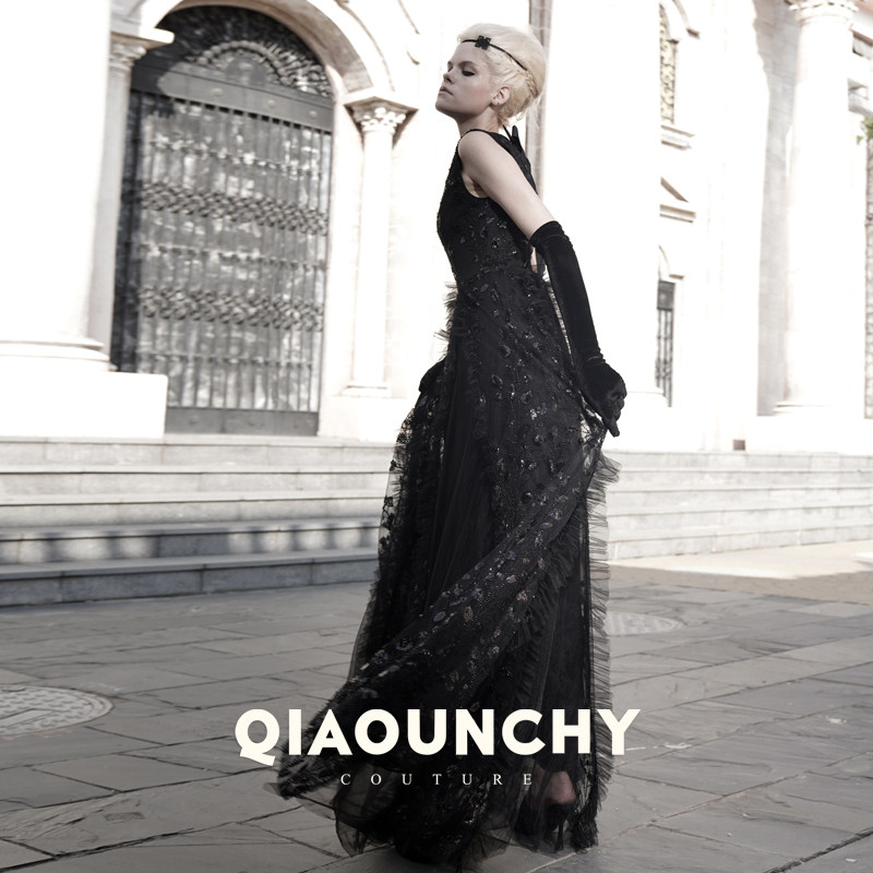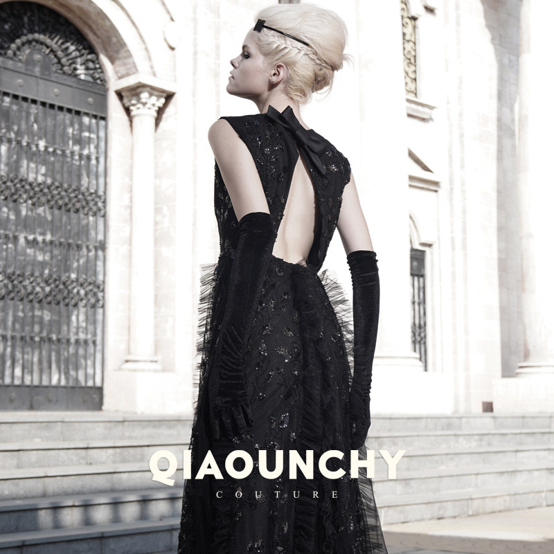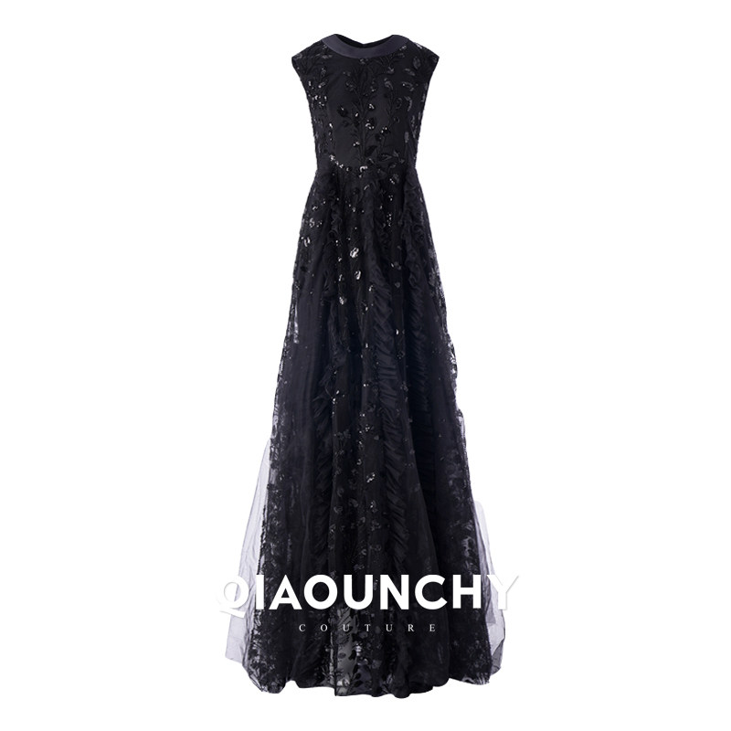 高定 QIAOUNCHY俏云曦|黑色珠片刺绣法式经典露背拖地晚礼服长裙