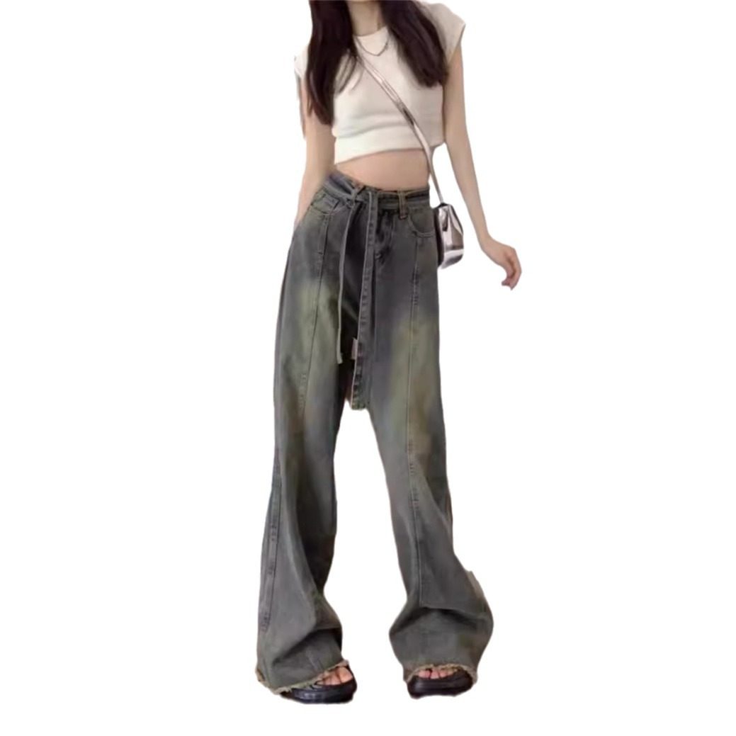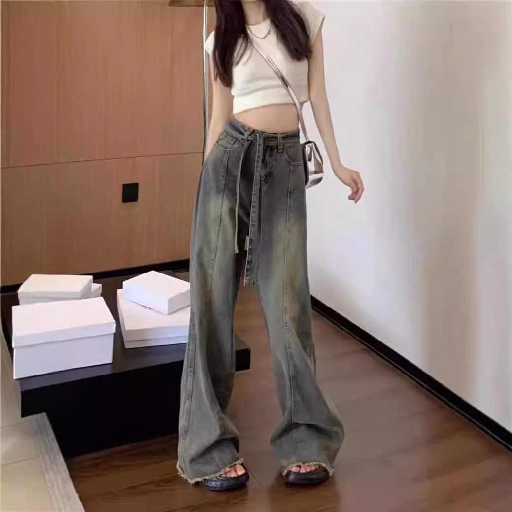 大码胖MM复古毛边阔腿牛仔裤女小个子辣妹高腰宽松显瘦直筒拖地裤