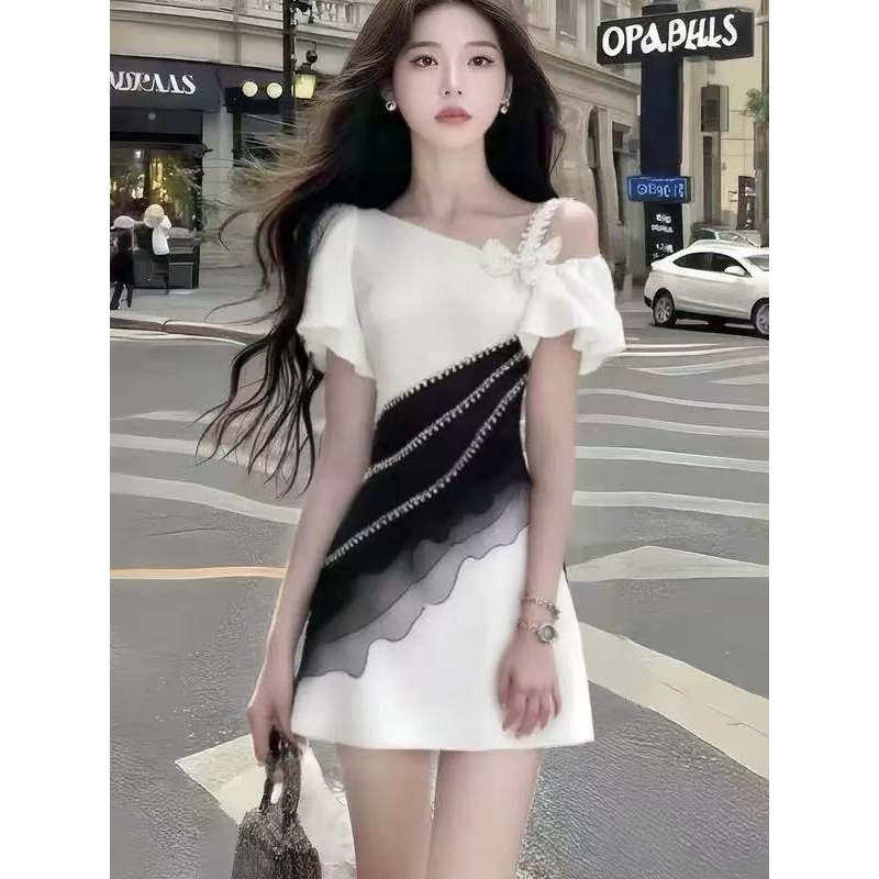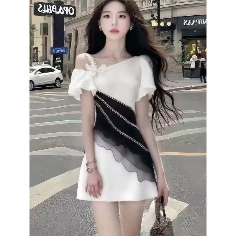 新款时尚温柔知性风别致设计感斜领收腰连衣裙显瘦减龄氛围感女装