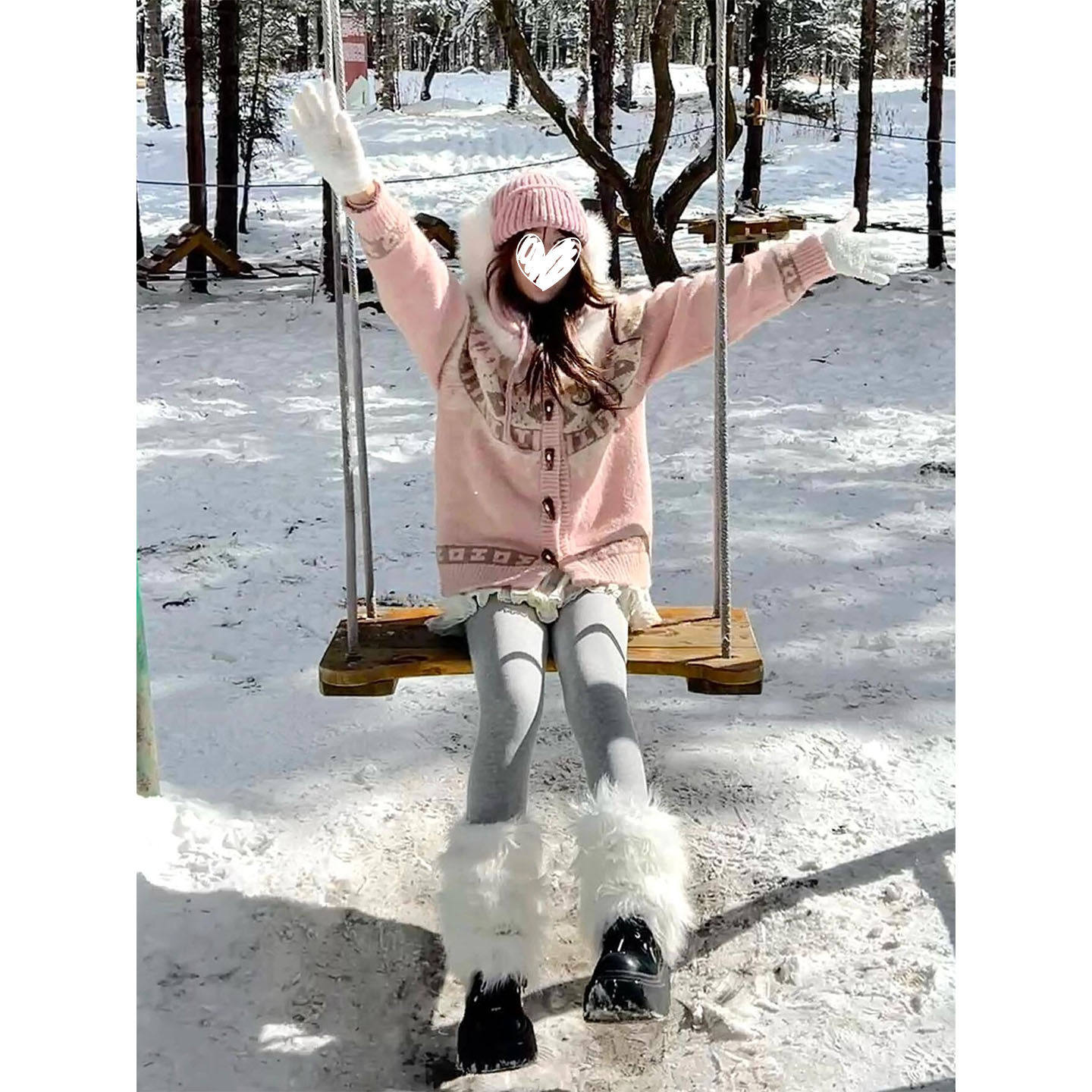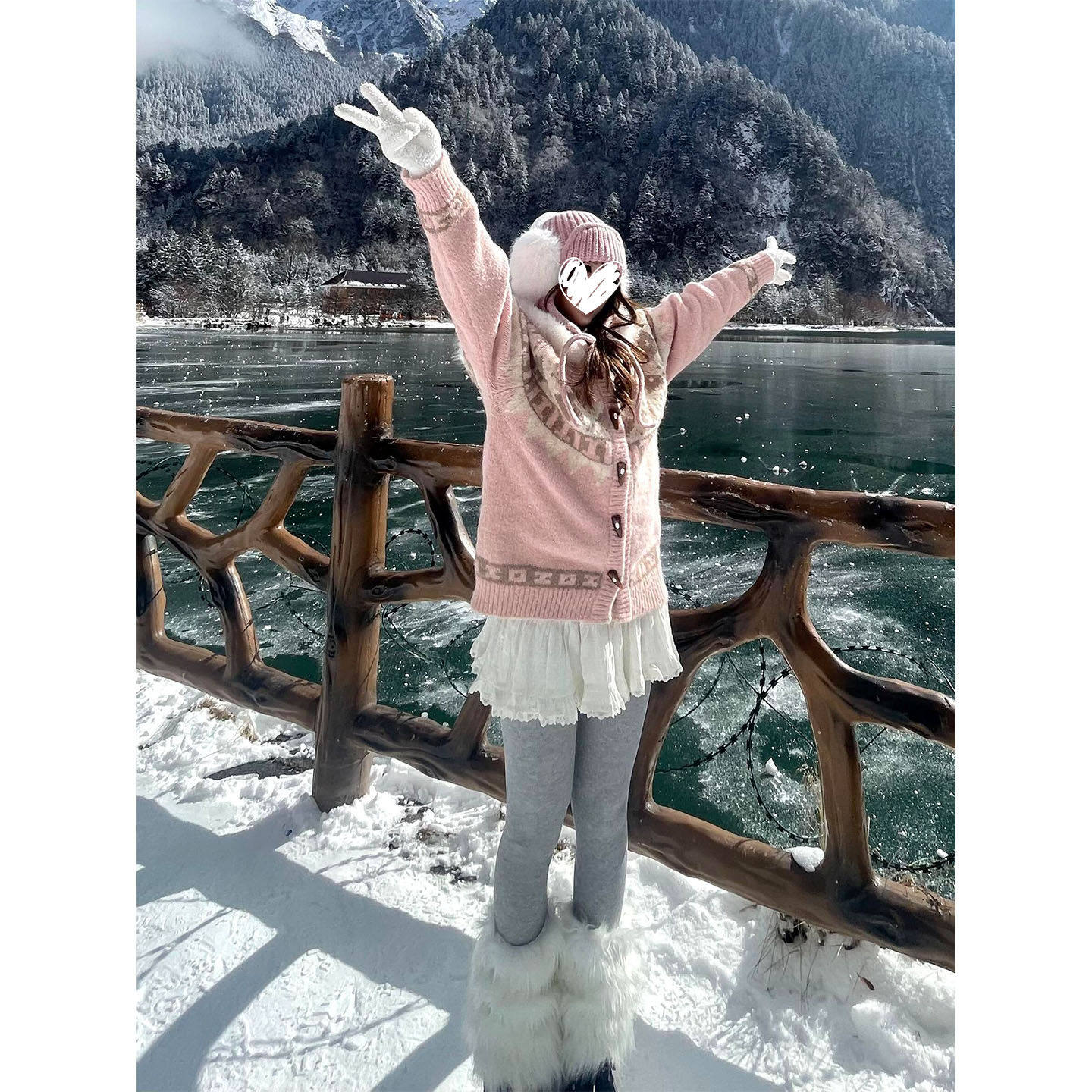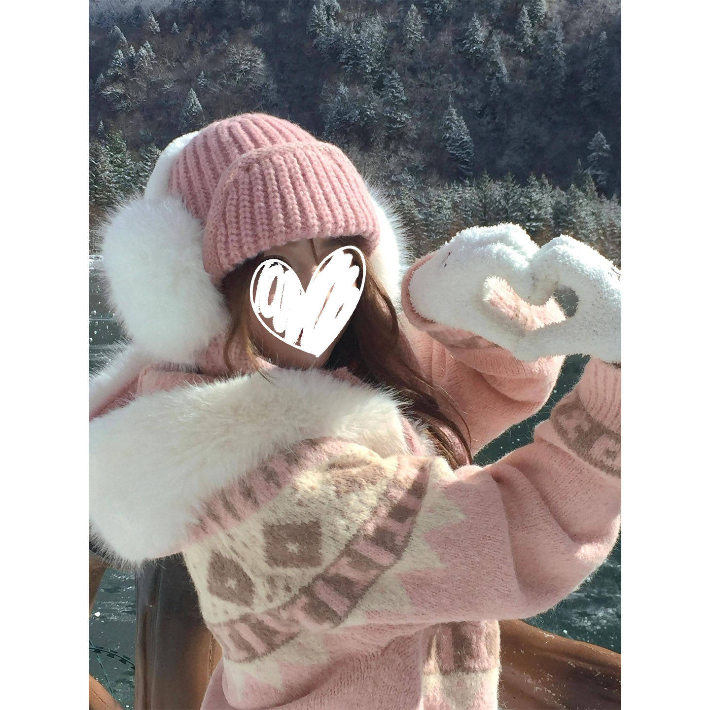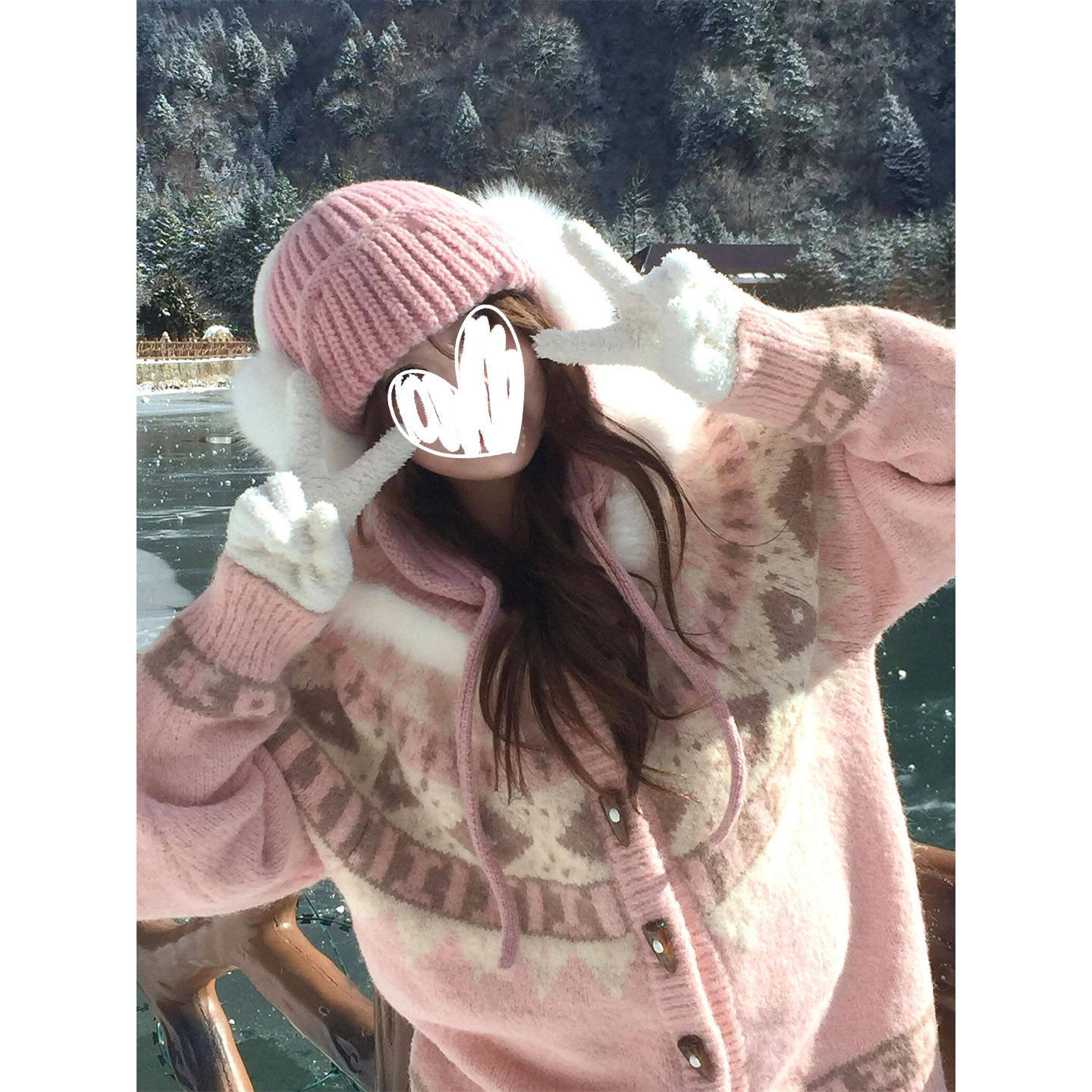 粉色连帽加绒毛领宽松针织外套女秋冬新款复古小众费尔岛长袖开衫