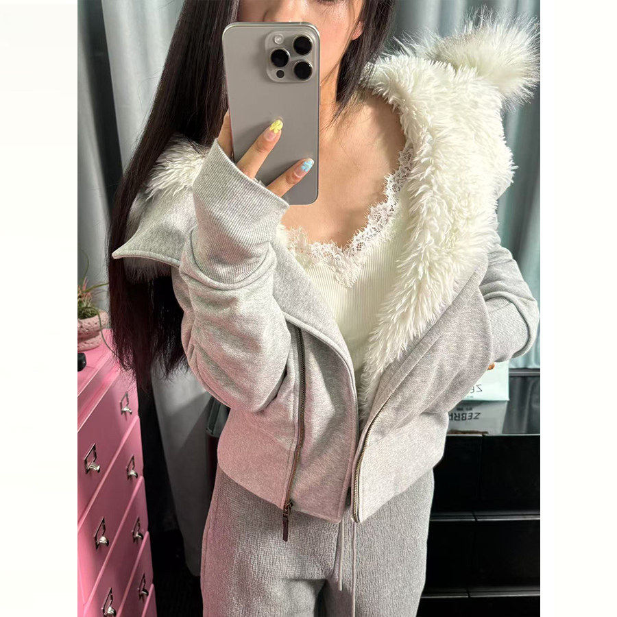 黑色连帽毛领斜襟毛绒内胆短版卫衣外套女秋冬季显瘦拉炼棉服开衫