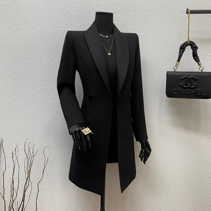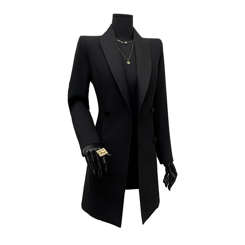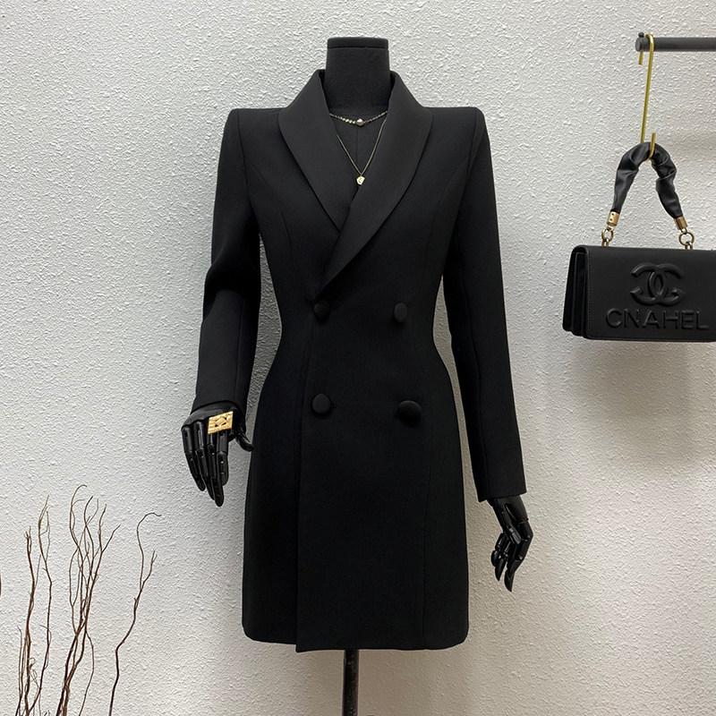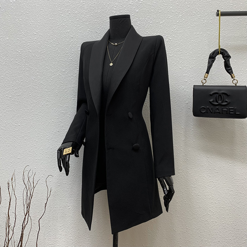 首页> 女装> 青果领双排扣黑色短外套西服女2025秋拼接领收腰遮肚显瘦西装上衣