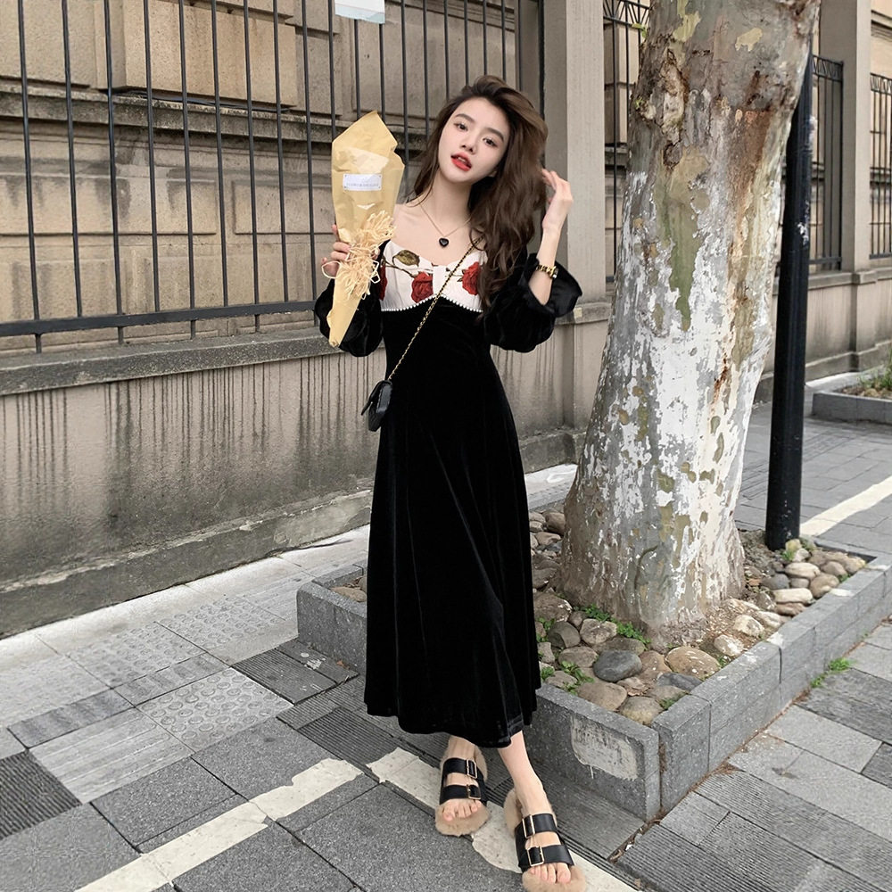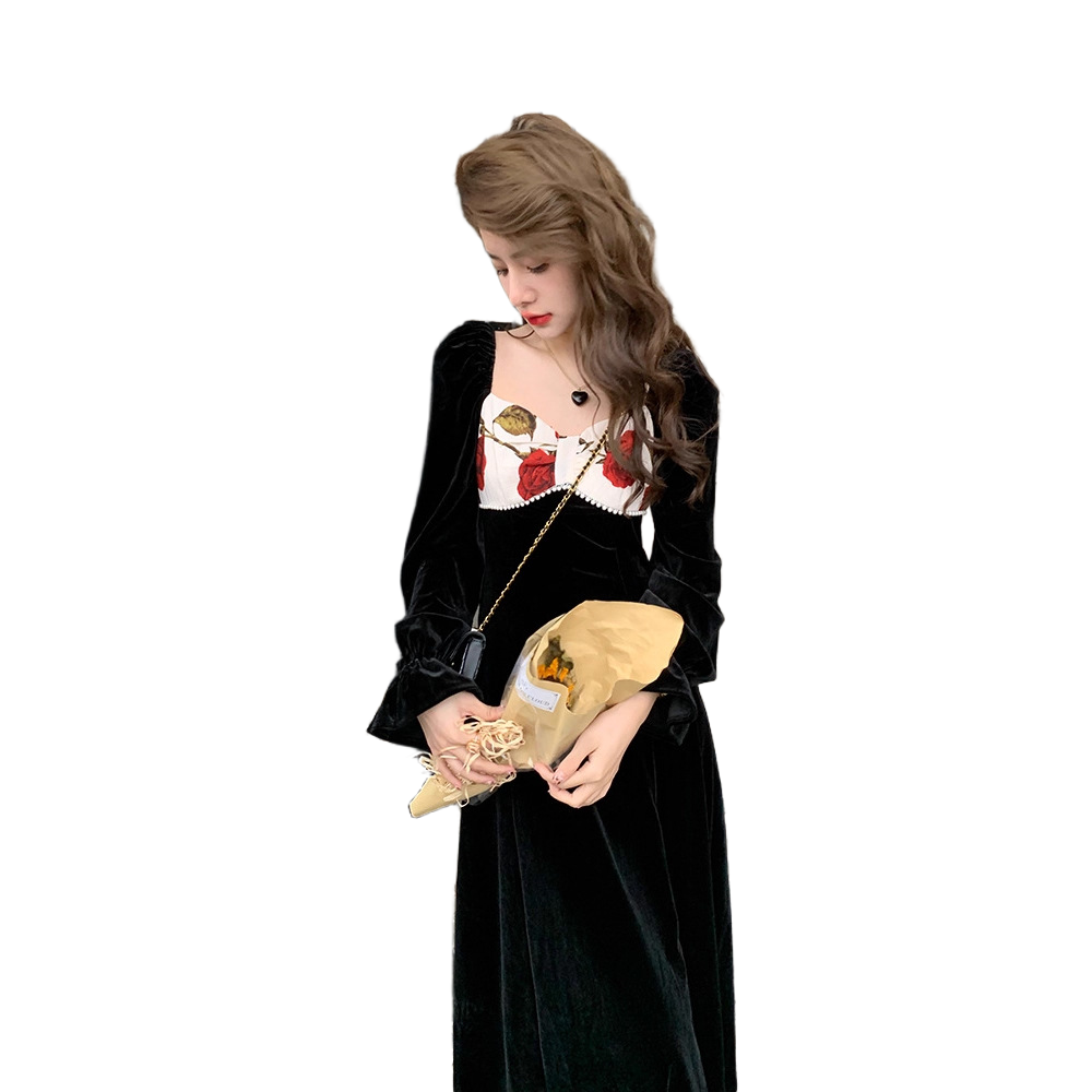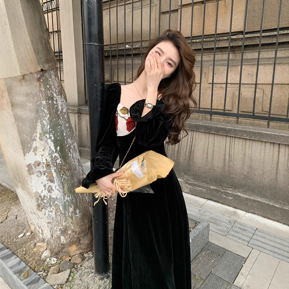 法式秋冬黑色绒连衣裙女赫本收腰显瘦温柔风气质复古礼服长