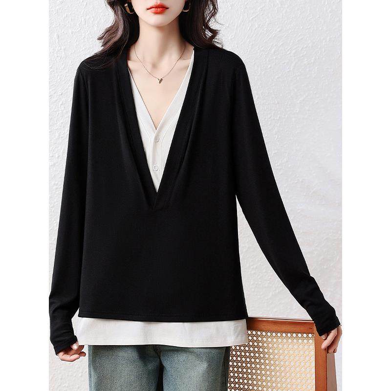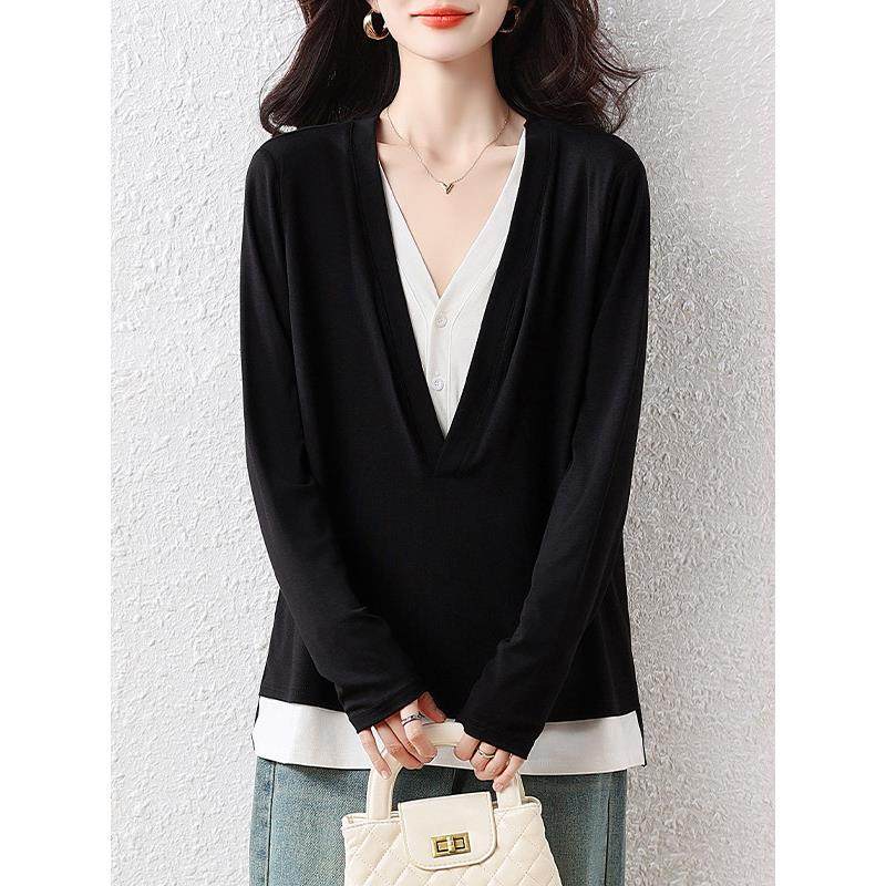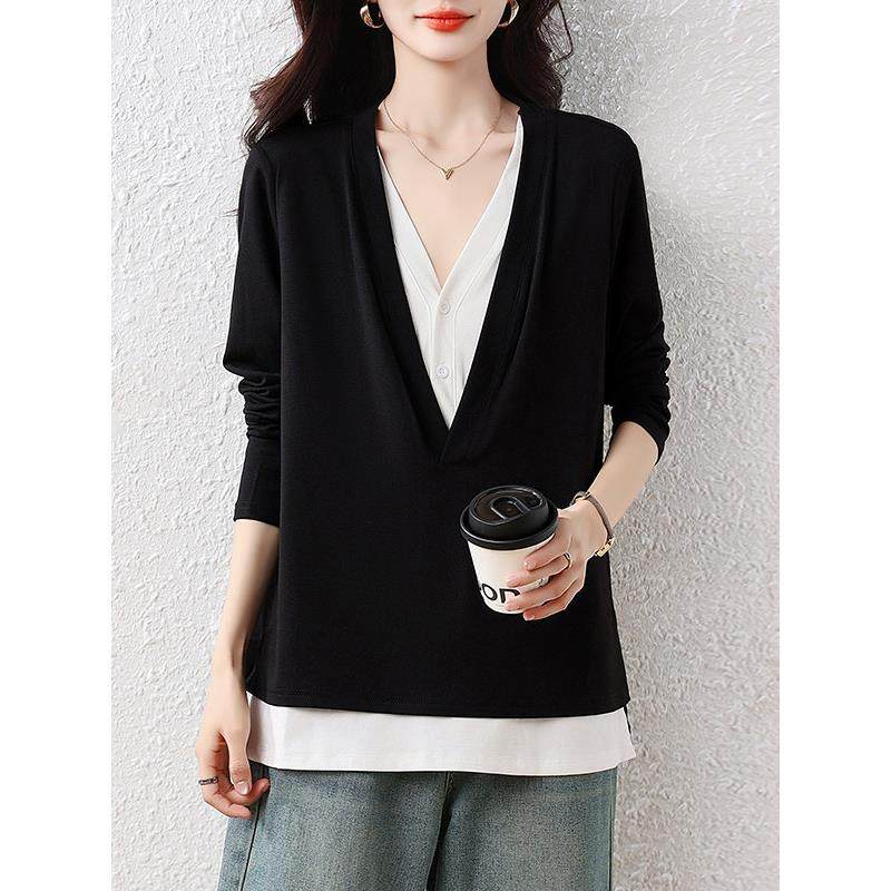 假两件V领撞色长袖T恤大码女装2025早秋新款时尚百搭套头宽松上衣
