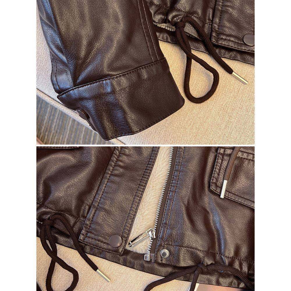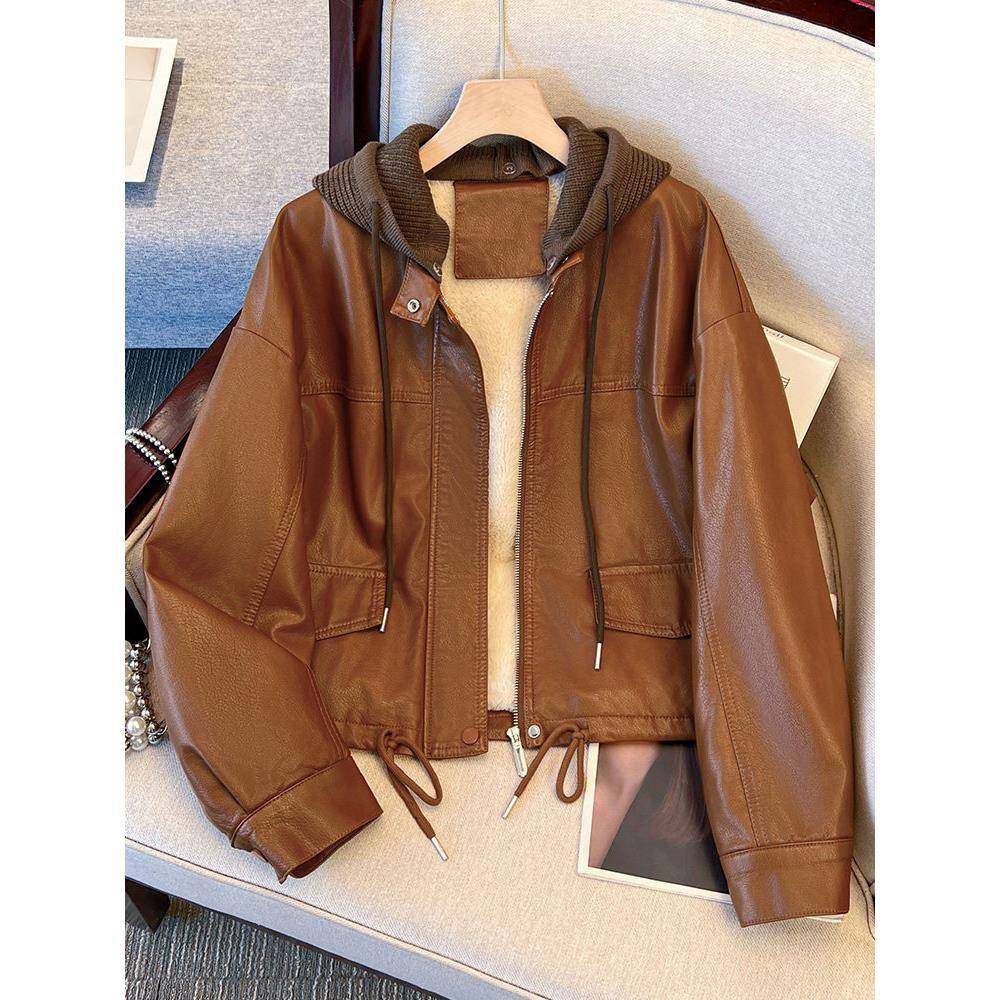 美拉德咖色连帽加绒皮衣女款2025新款爆款洋气巨好看的初冬厚外套