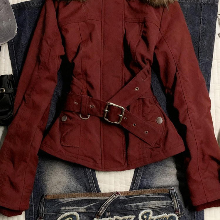 首页> 女装> 复古红色vintage毛领连帽外套女秋冬季新款设计感小众派克服上衣