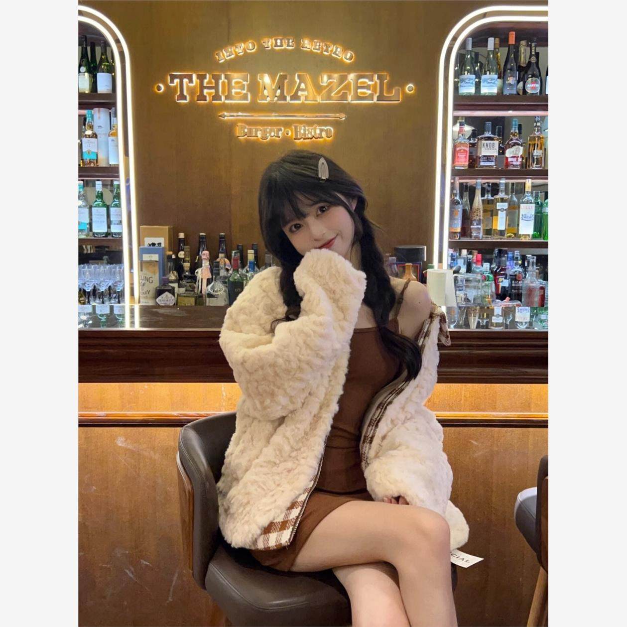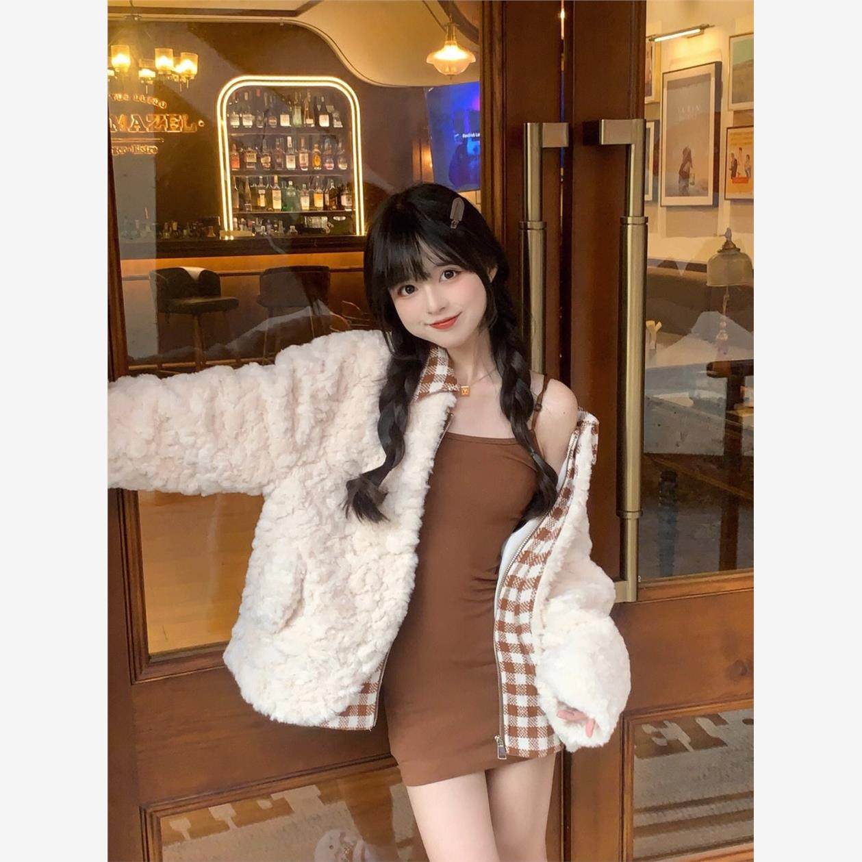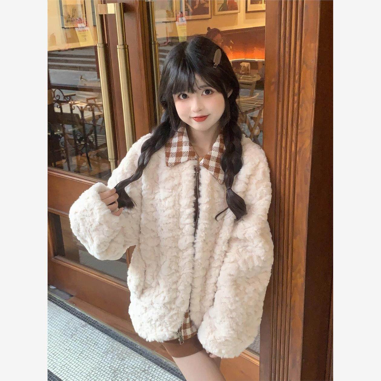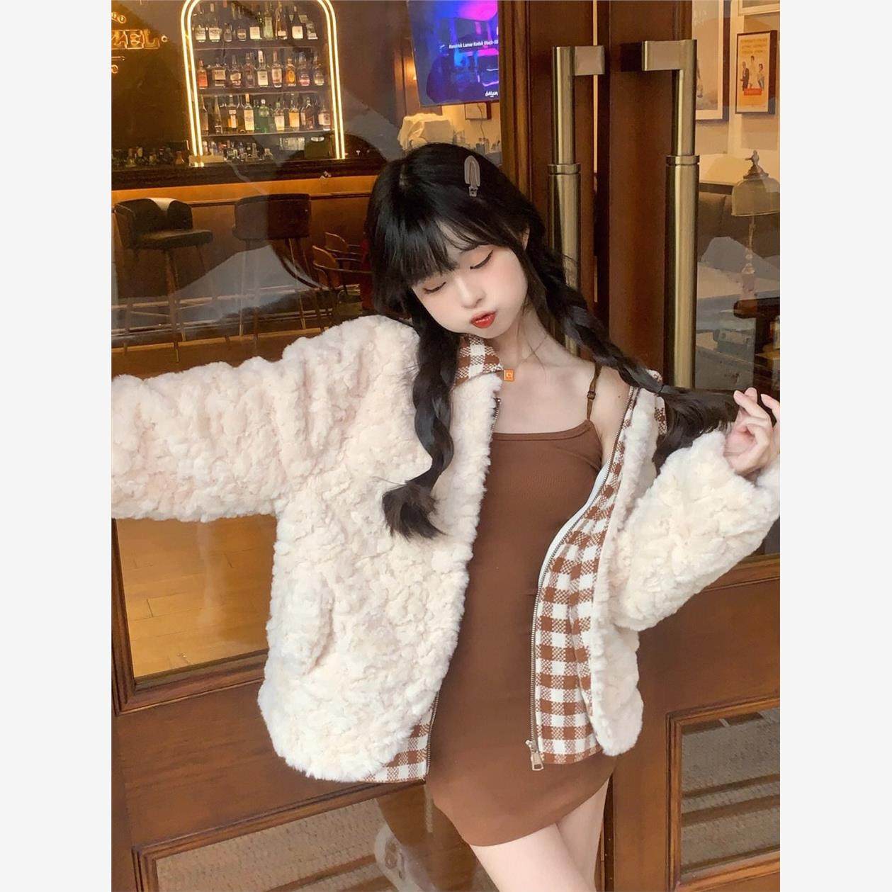 2024秋冬羊羔毛外套女甜美小个子拼接棋盘格环保皮草獭兔毛绒加厚