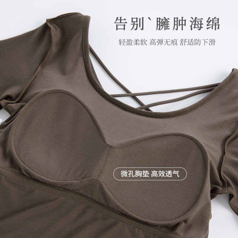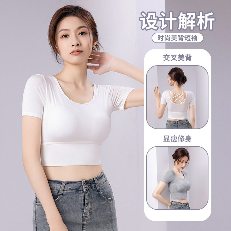 超大码莫代尔200斤胖MM露肚脐胖MM短袖T恤带胸垫交叉美背瑜伽运动
