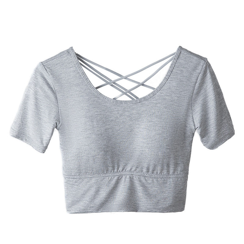 首页> 女装> 超大码莫代尔200斤胖MM露肚脐胖MM短袖T恤带胸垫交叉美背瑜伽运动