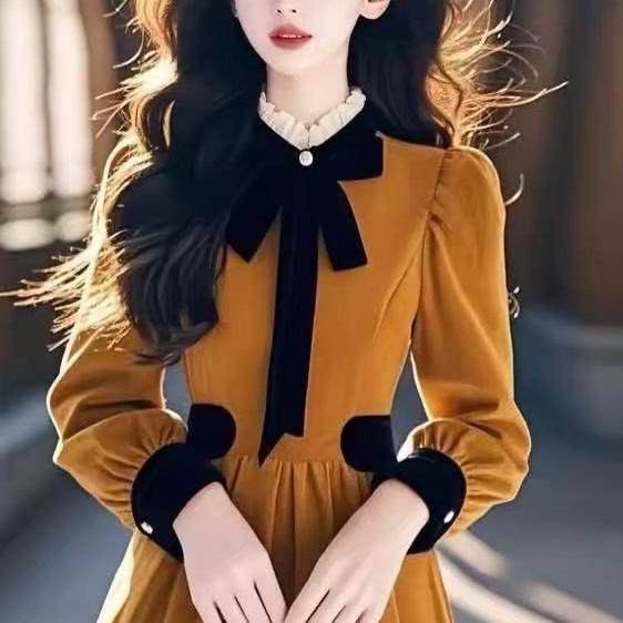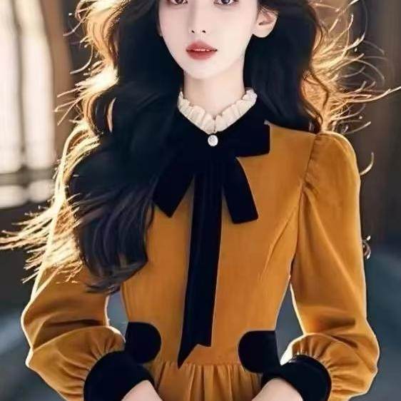 加绒加厚超好看黄色丝绒连衣裙女春秋冬季礼服法式修身打底长裙子