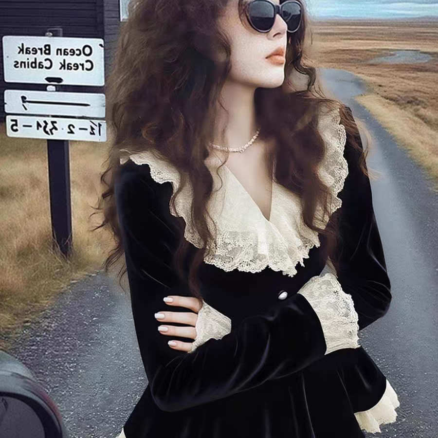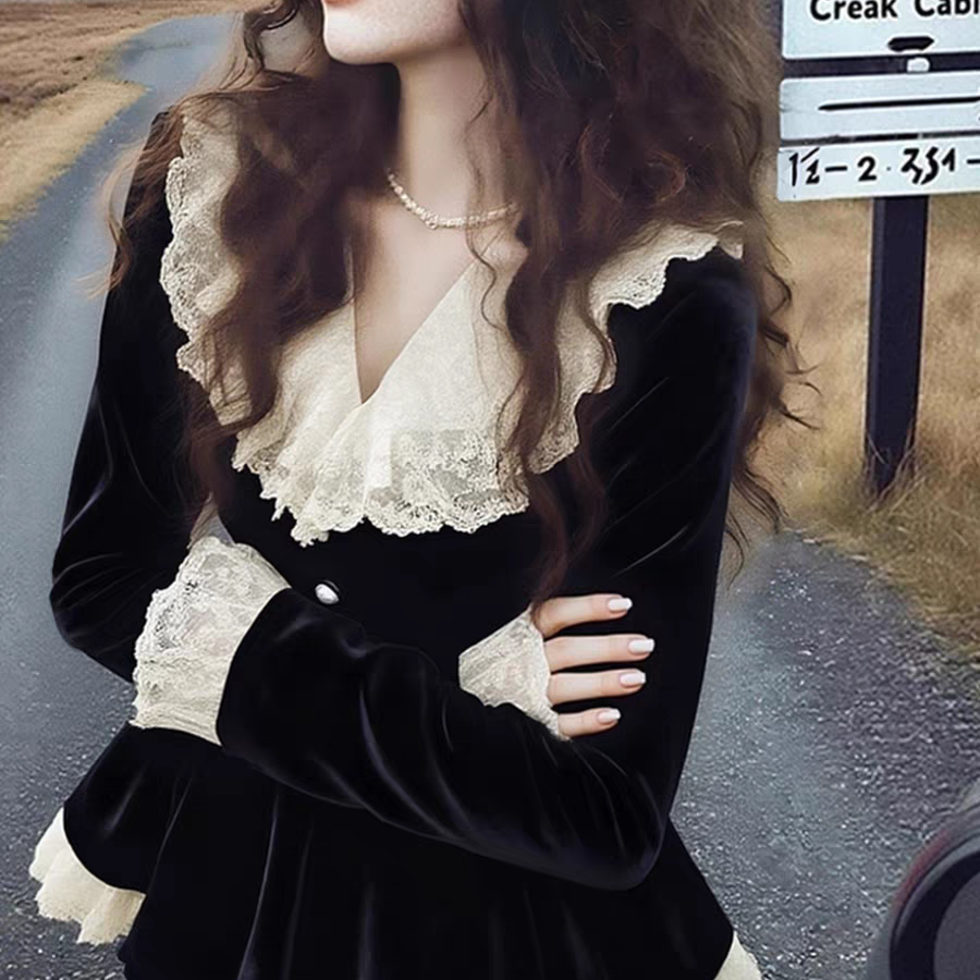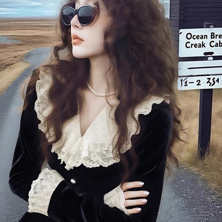 2025冬季新款爆款洋气巨好看法式蕾丝花边拼接黑色荷叶边丝绒上衣