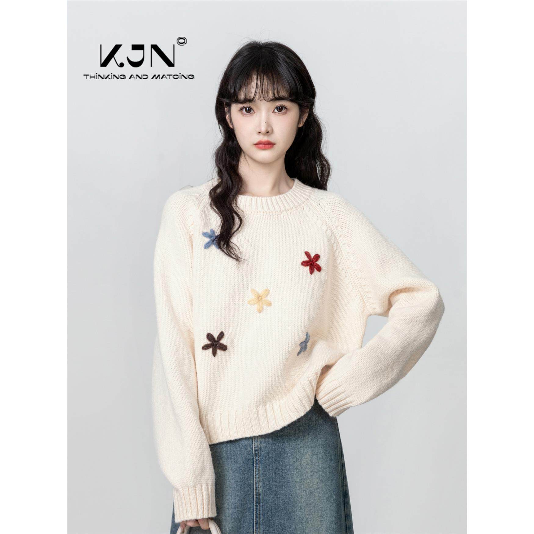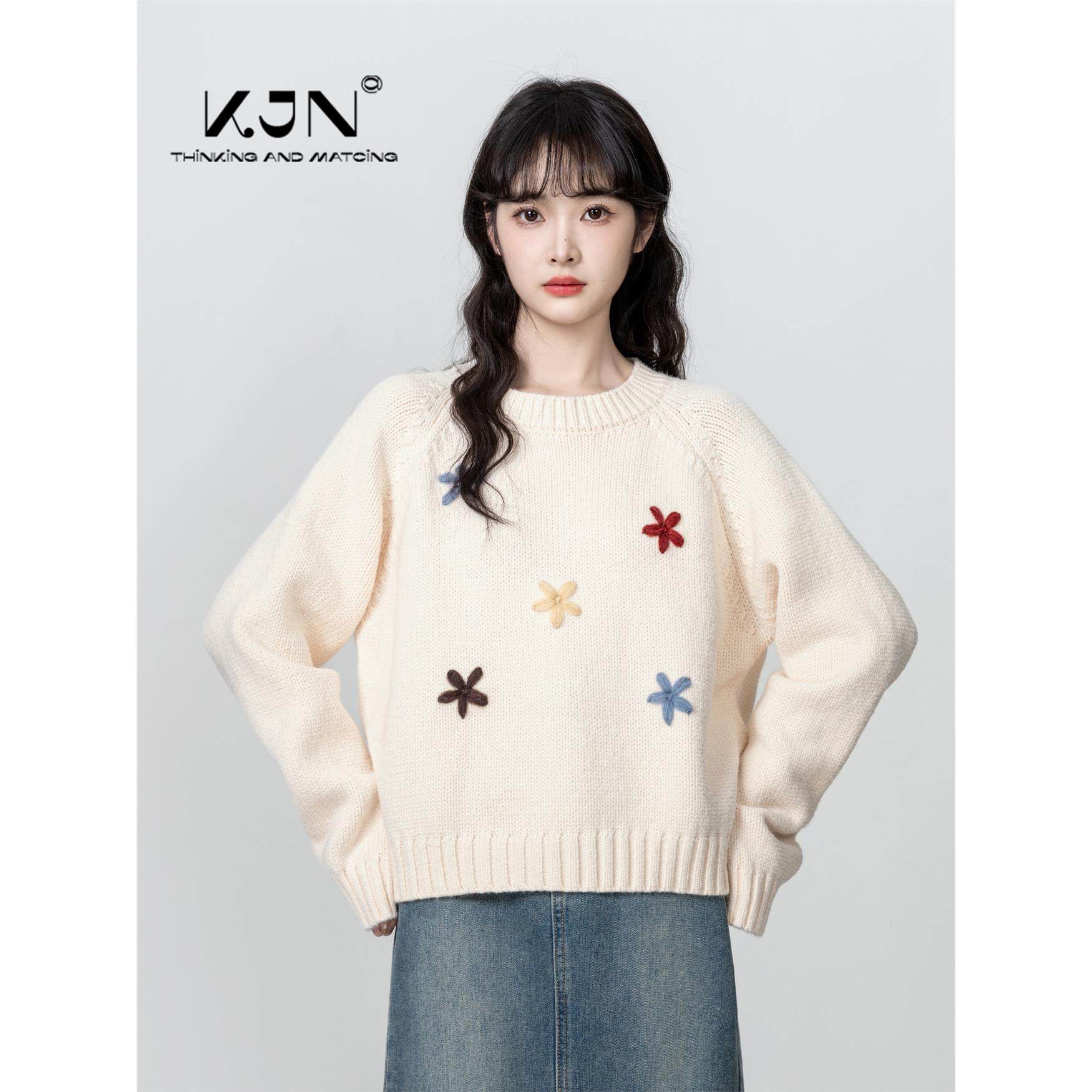 圆领加厚毛衣女2025秋冬新款宽松刺绣套头内搭针织衫小个子短上衣