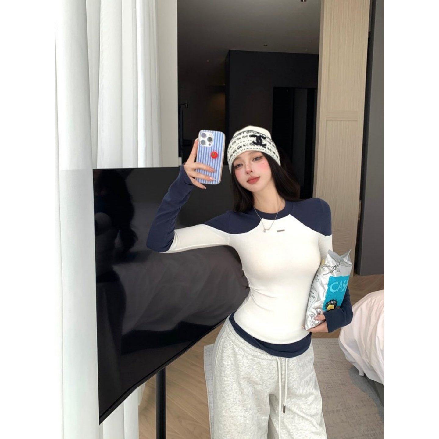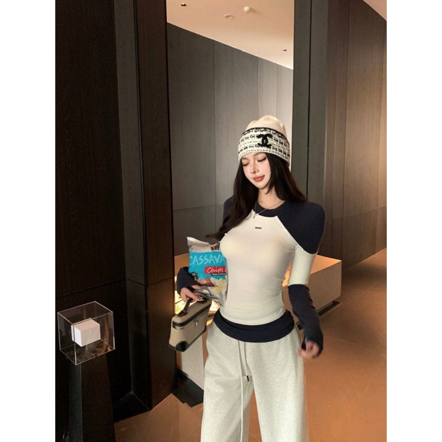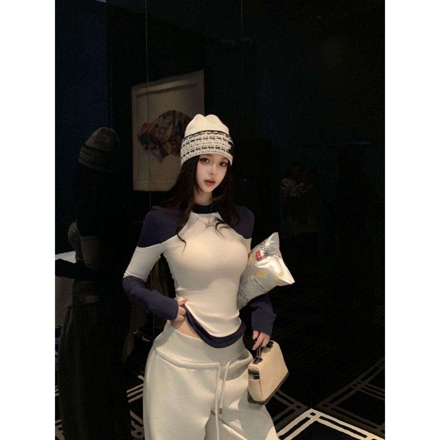 2026巨好看搭配一整套辣妹风打底圆领长袖上衣高腰显瘦阔腿长裤