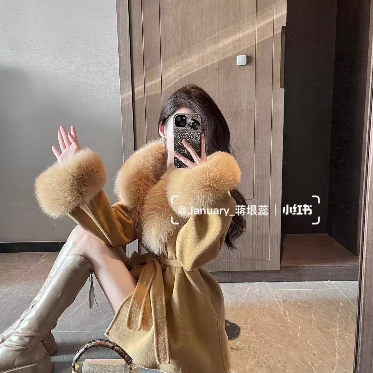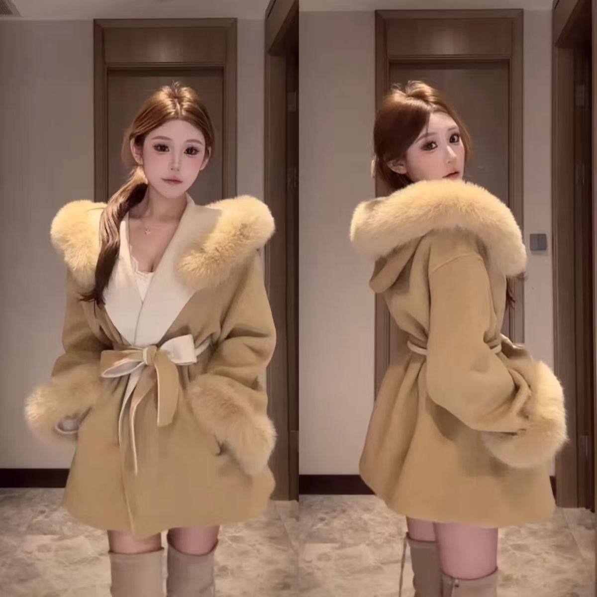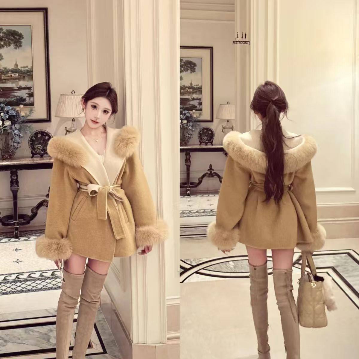 2025秋季新款韩系时尚高级感毛呢外套女纯欲风毛领外套显瘦外套