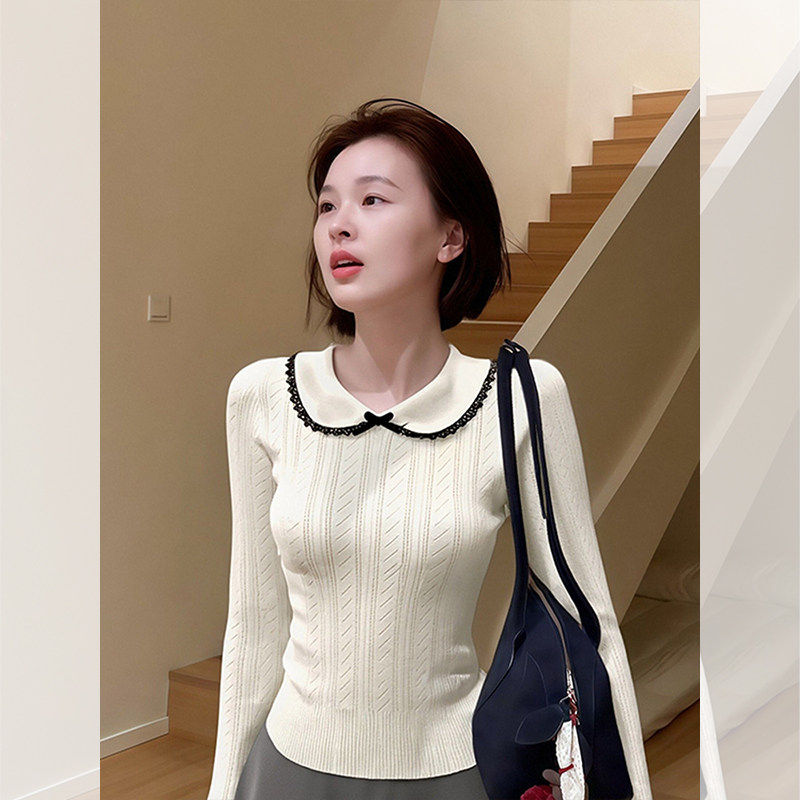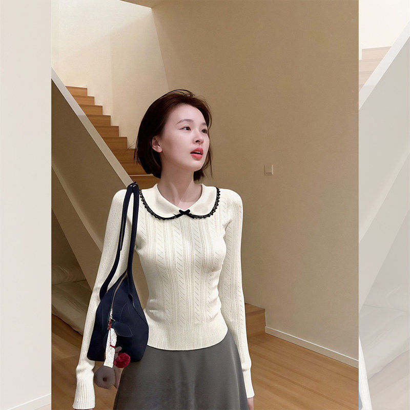 法式白色娃娃领翻领长袖针织衫女秋冬毛衣打底衫内搭软糯加厚上衣