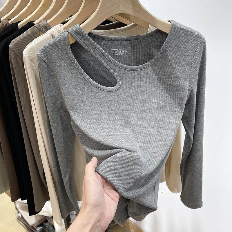 韩国斜领镂空锁骨长袖T恤女2025新款春秋修身洋派内搭打底衫上衣