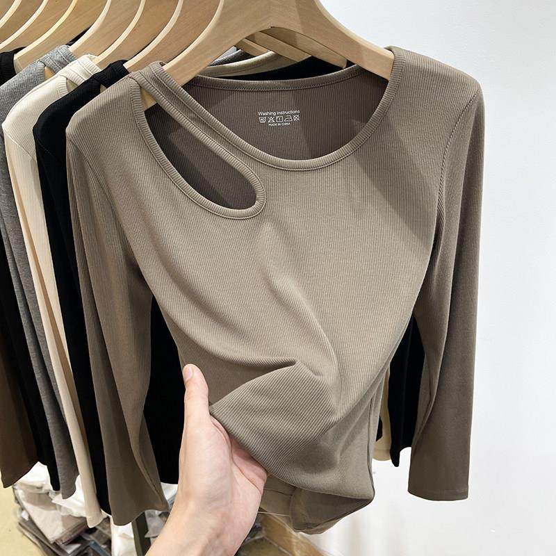 首页> 女装> 韩国斜领镂空锁骨长袖T恤女2025新款春秋修身洋派内搭打底衫上衣