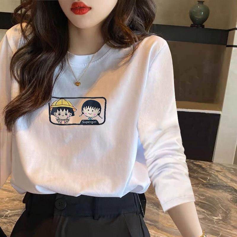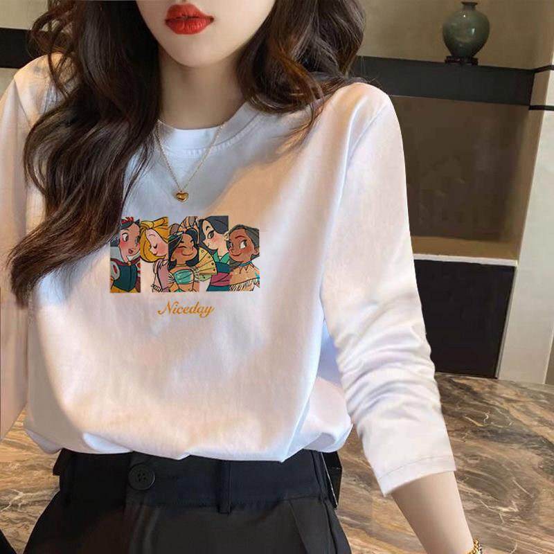 韩国正肩白色t恤女2025秋季新款宽松长袖印花纯棉内搭打底衫上衣
