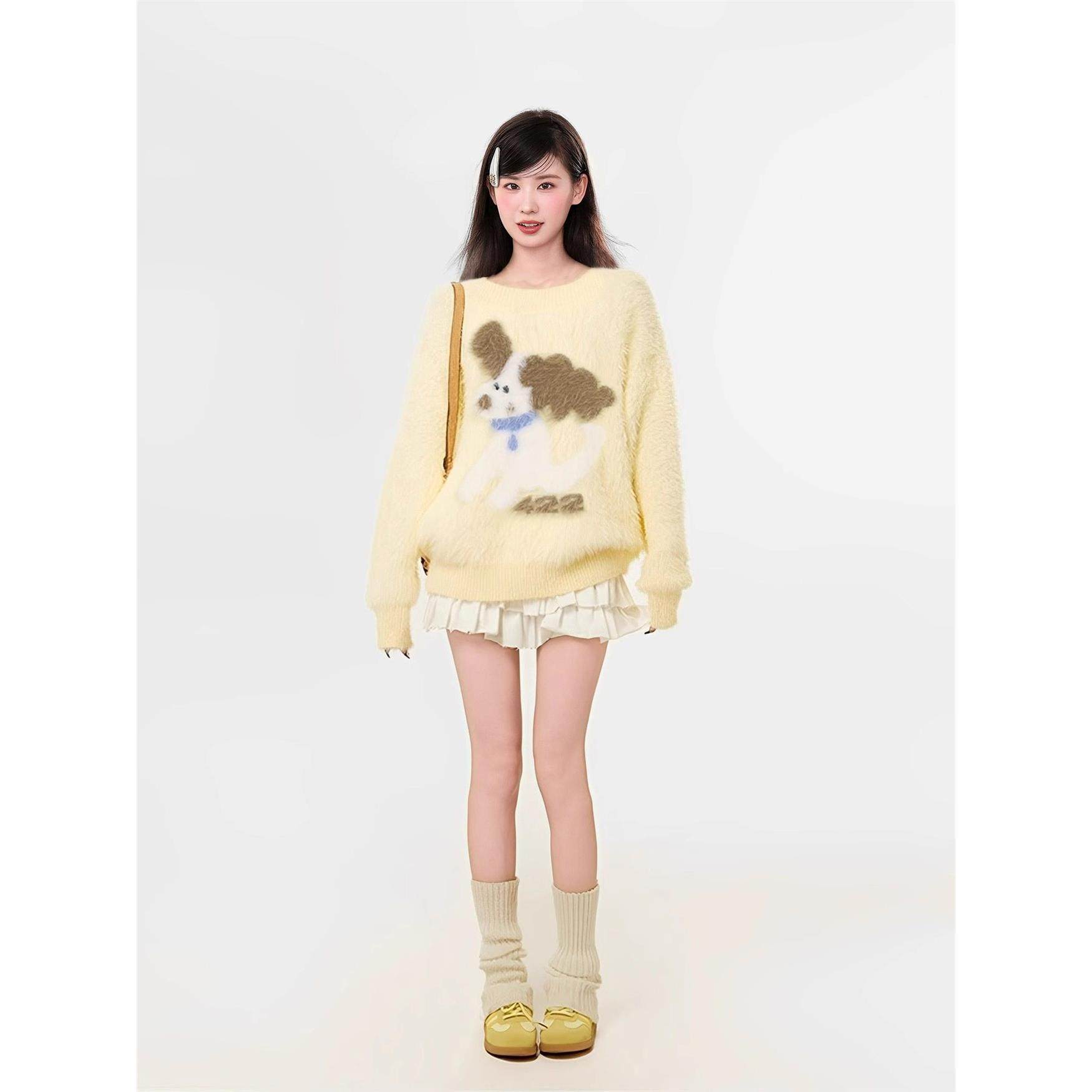 黄色小狗水貂绒套头毛衣女秋冬季软糯慵懒风加绒加厚内搭针织上衣