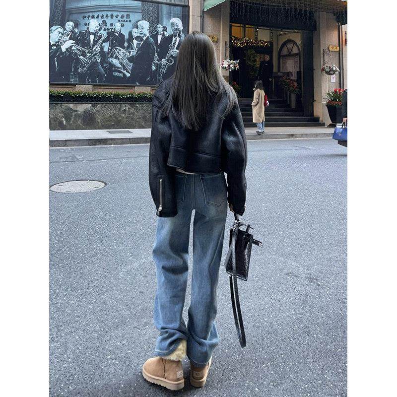 窄版直筒牛仔裤2025秋季穿搭女装高腰宽松显瘦高个子加绒阔腿裤子