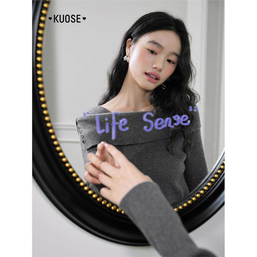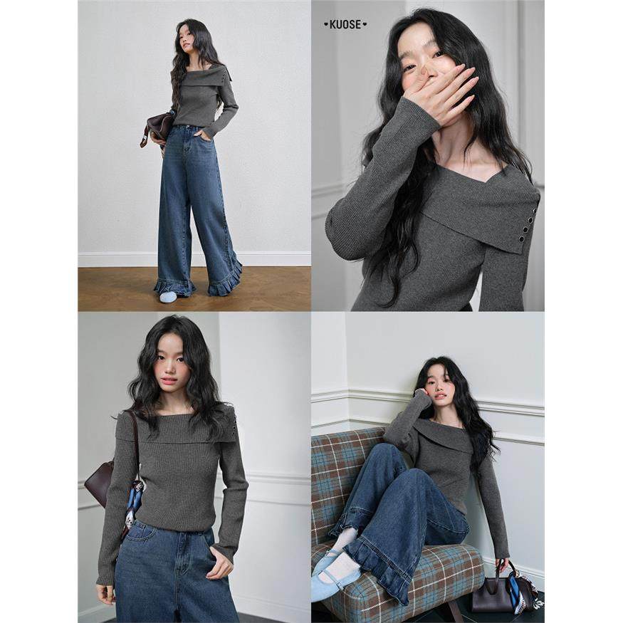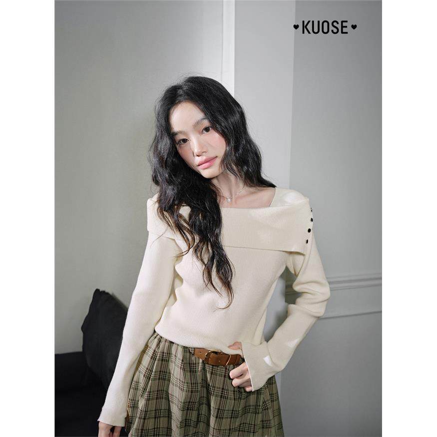 阔色杏色一字肩显瘦长袖针织衫女2025秋季新款气质内搭打底衫毛衣
