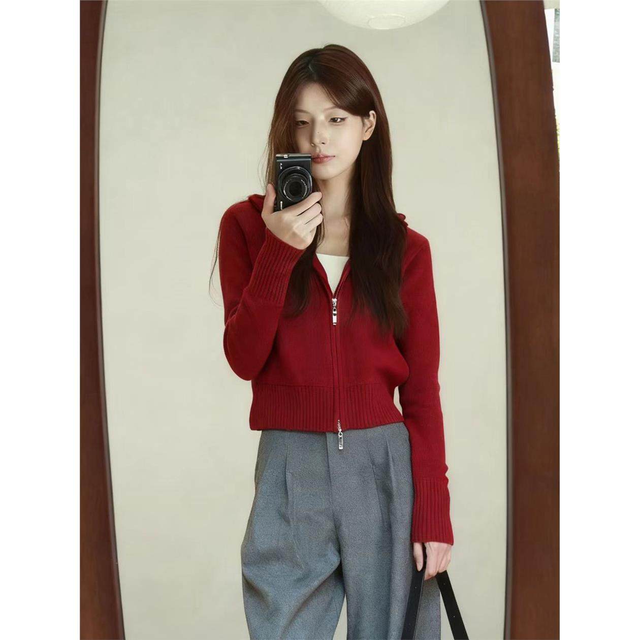 红色立领口袋针织开衫女秋冬新款美拉德穿搭新年小香风毛衣外套厚