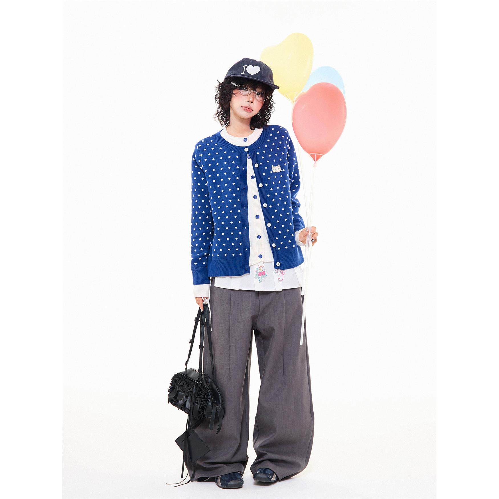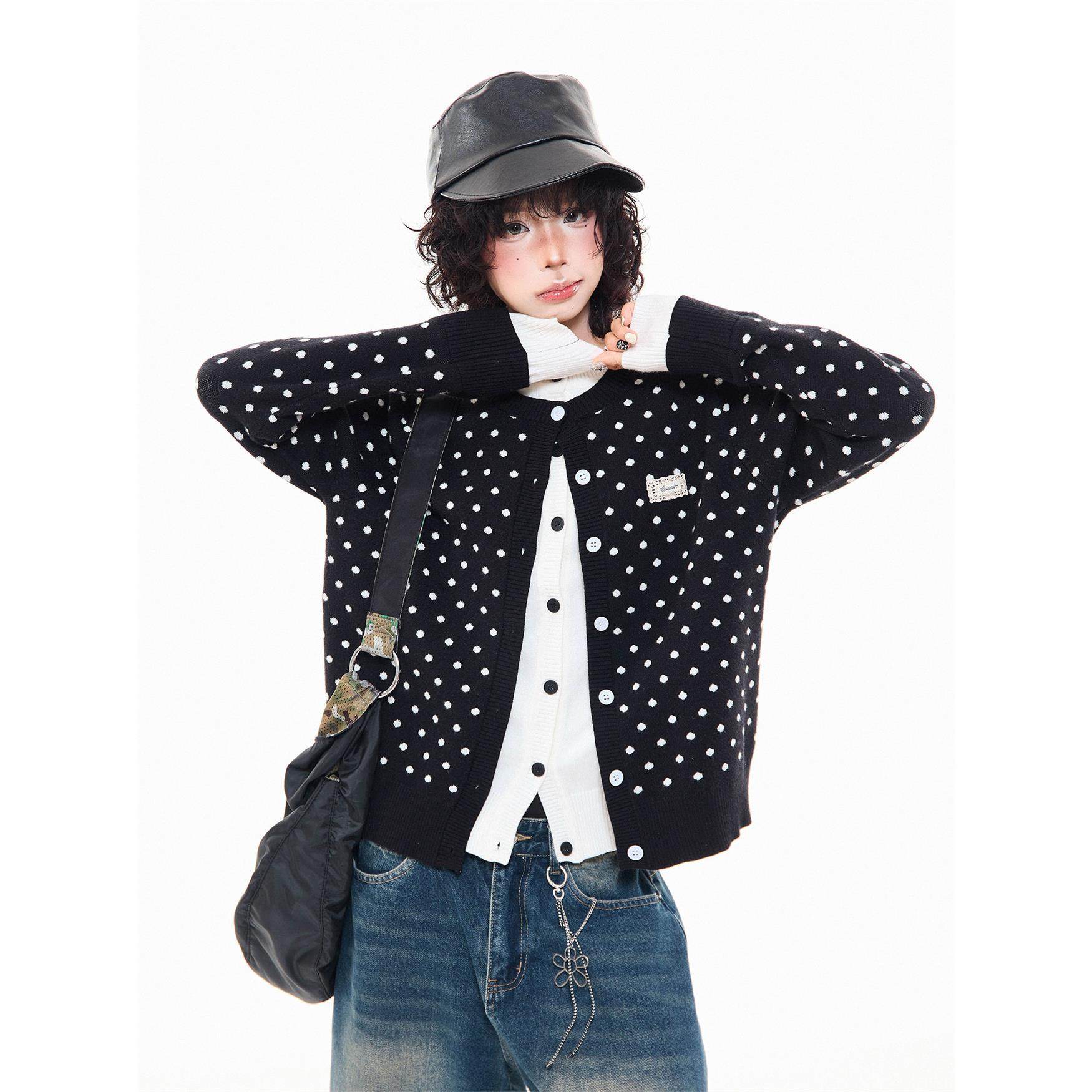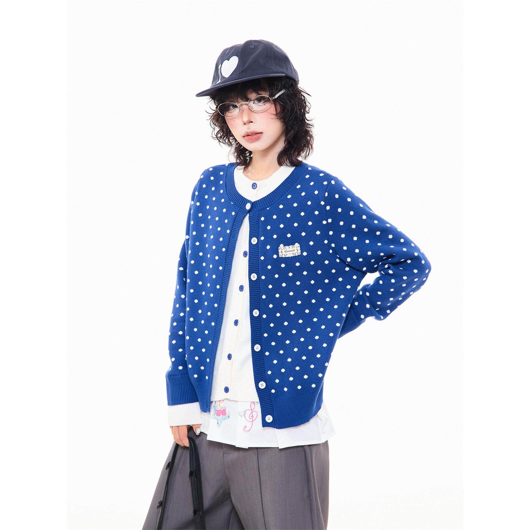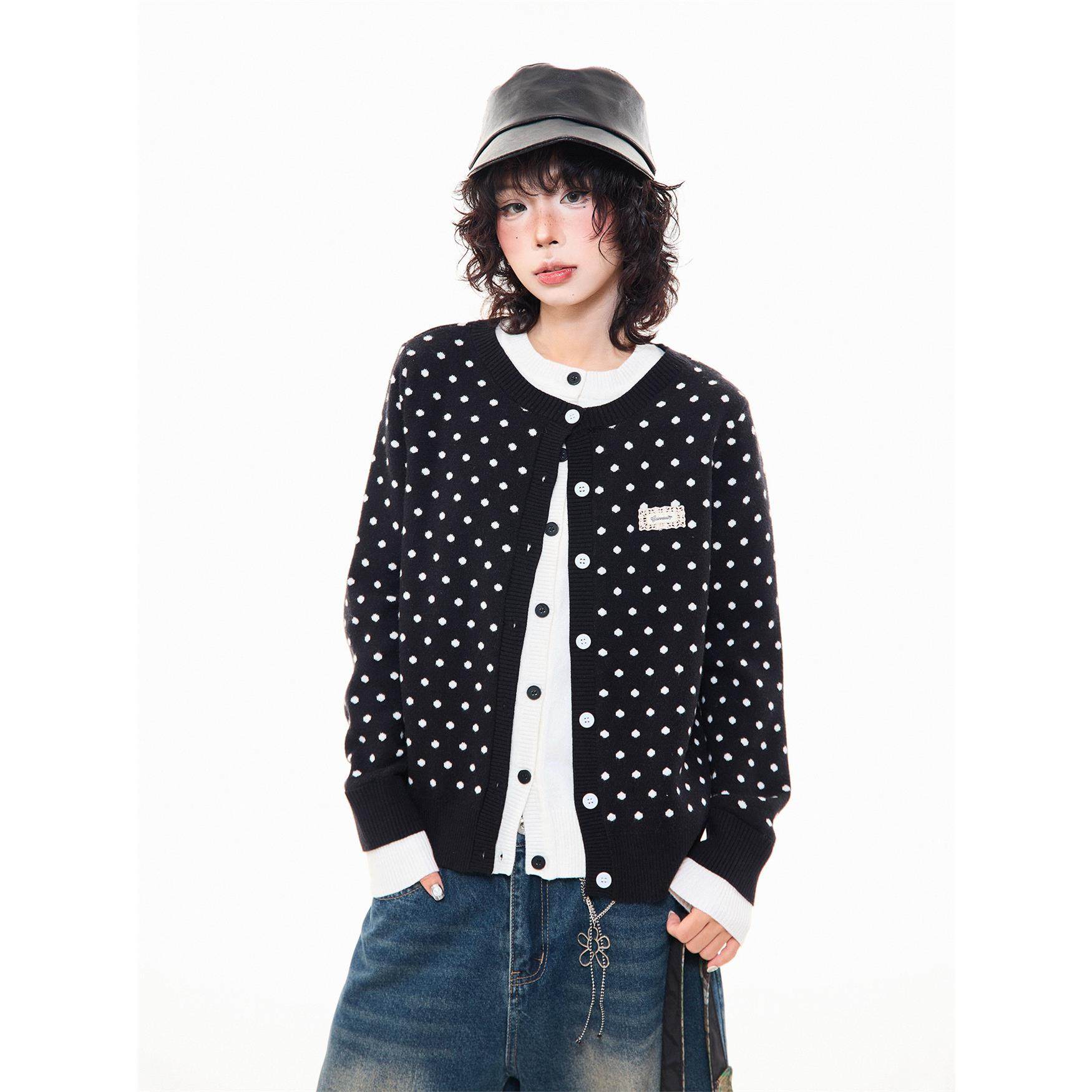 MIKYO 美式覆古波点撞色假两件针织毛衣女秋季休闲慵懒感开衫上衣