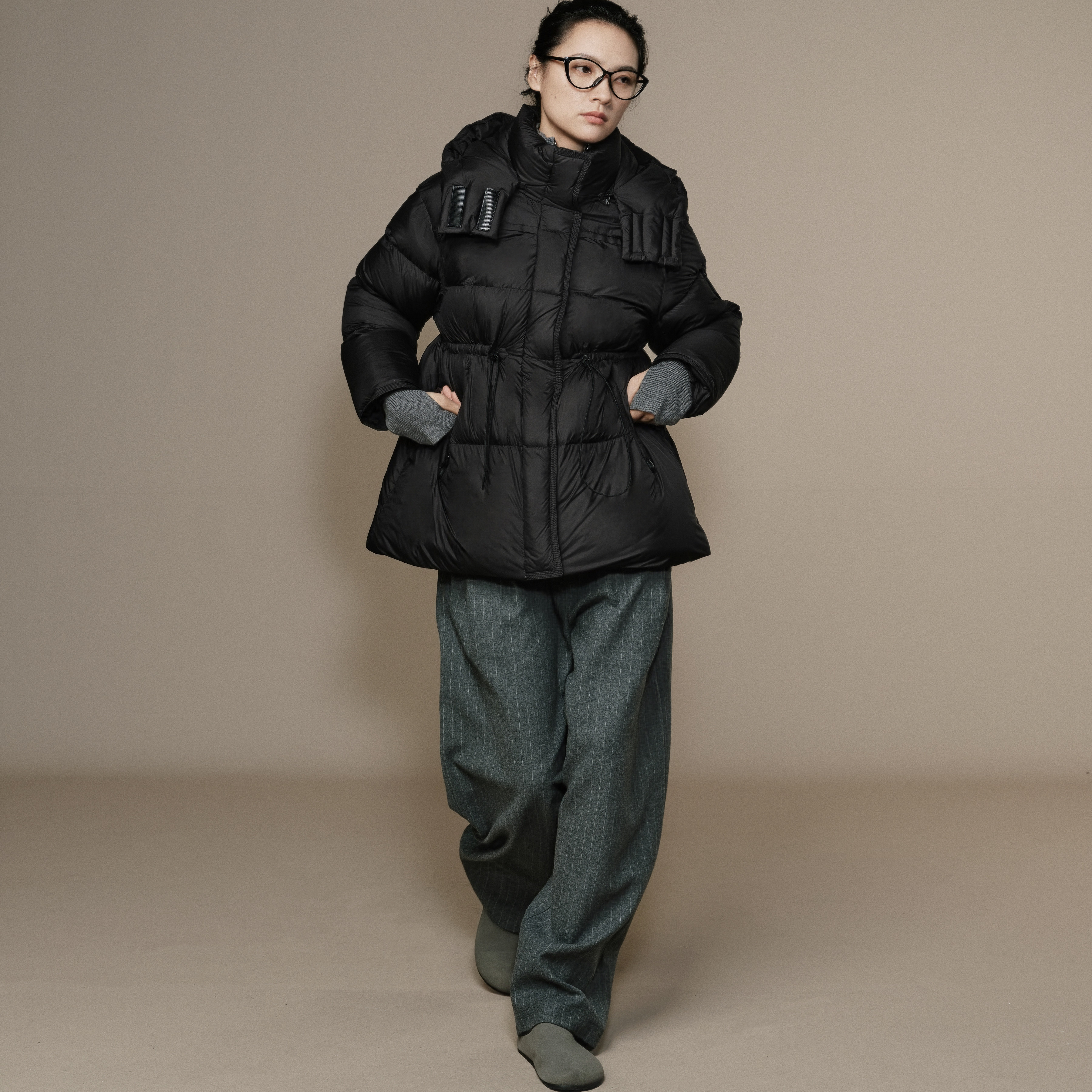 露韵诗泡芙款可调整收腰中长时尚保暖羽绒服021