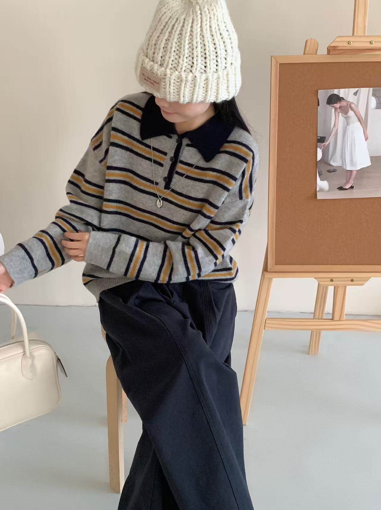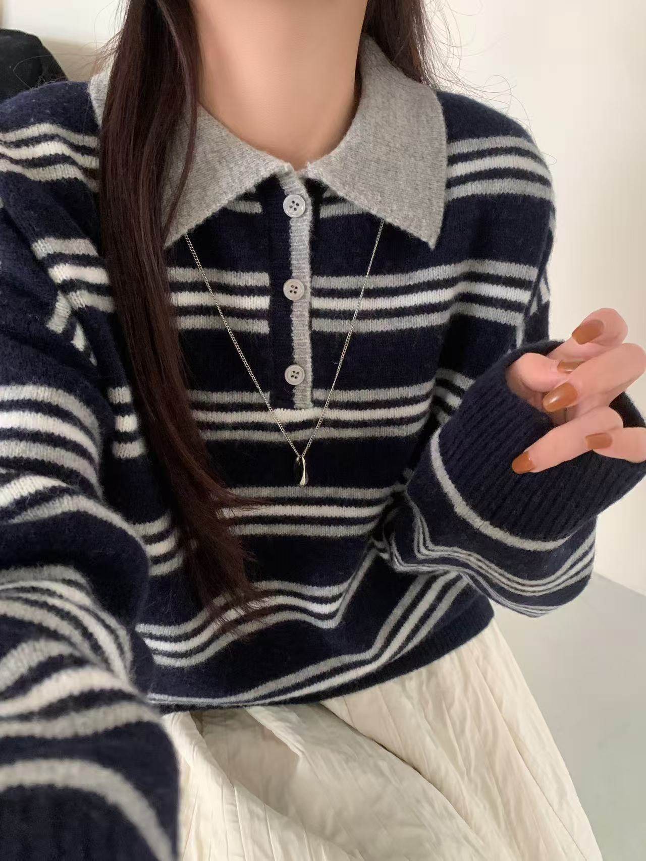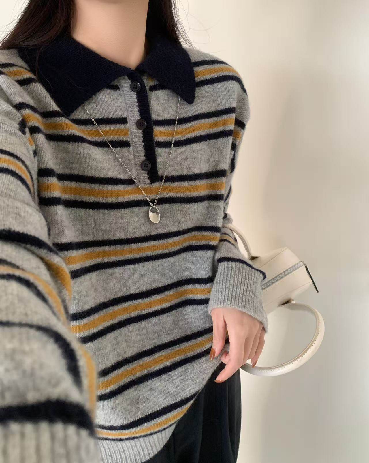 首页> 女装> 全羊毛韩系复古撞色条纹翻领毛衣女2025春季新款慵懒宽松百搭上衣