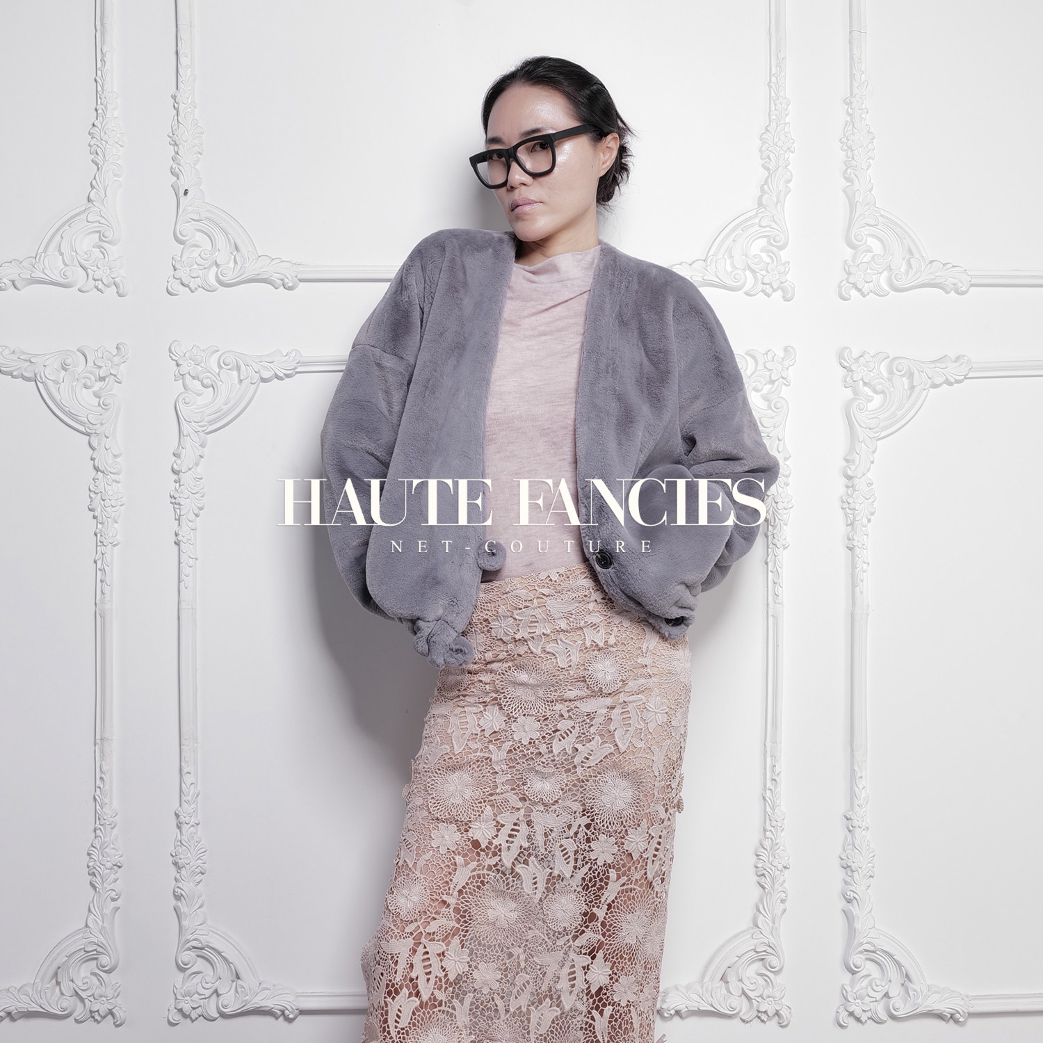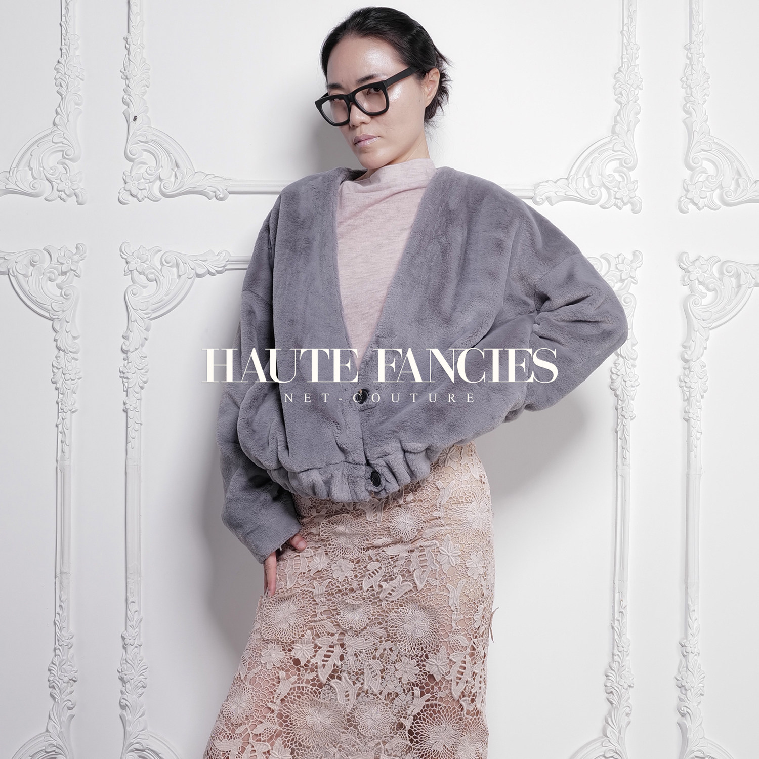 HAUTE FANCIES后构想|浅灰极简宽松大V领仿生水獭毛长袖超短外套
