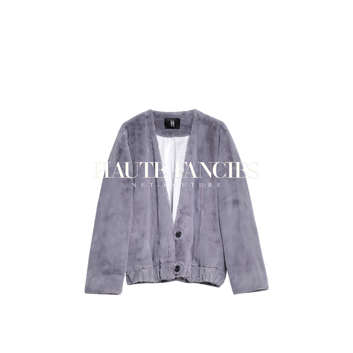 首页> 女装> HAUTE FANCIES后构想|浅灰极简宽松大V领仿生水獭毛长袖超短外套