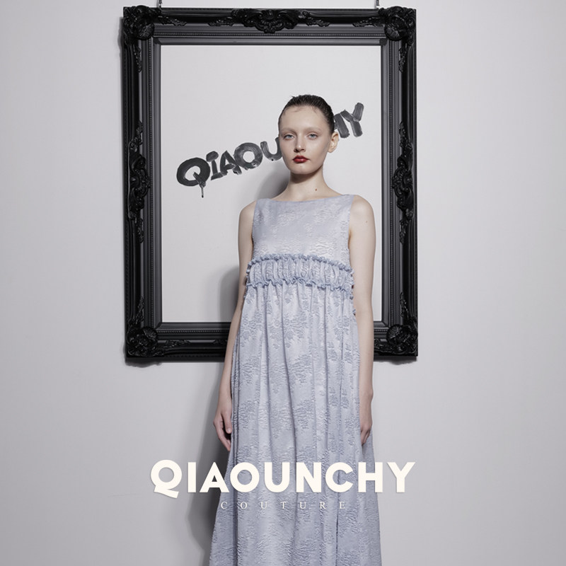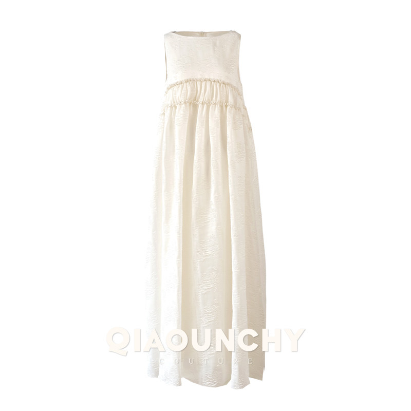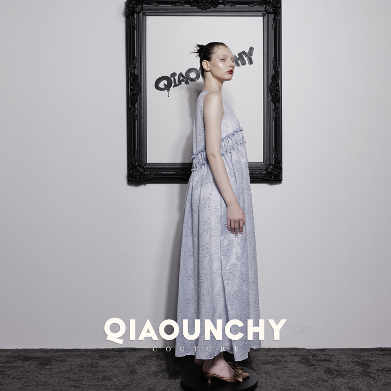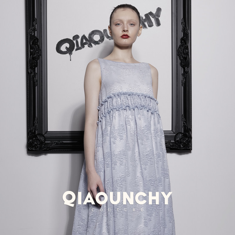 白月光 QIAOUNCHY俏云曦|黛蓝色杏色浮雕提花一字领无袖连衣裙