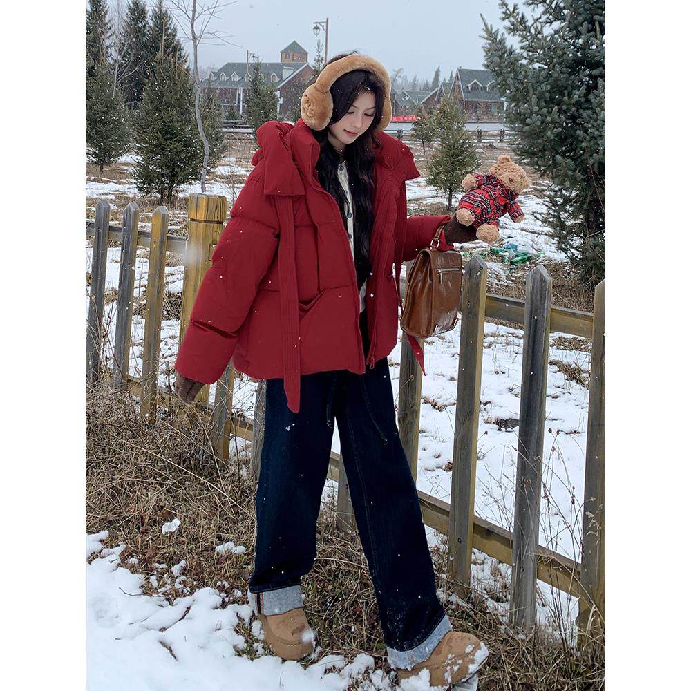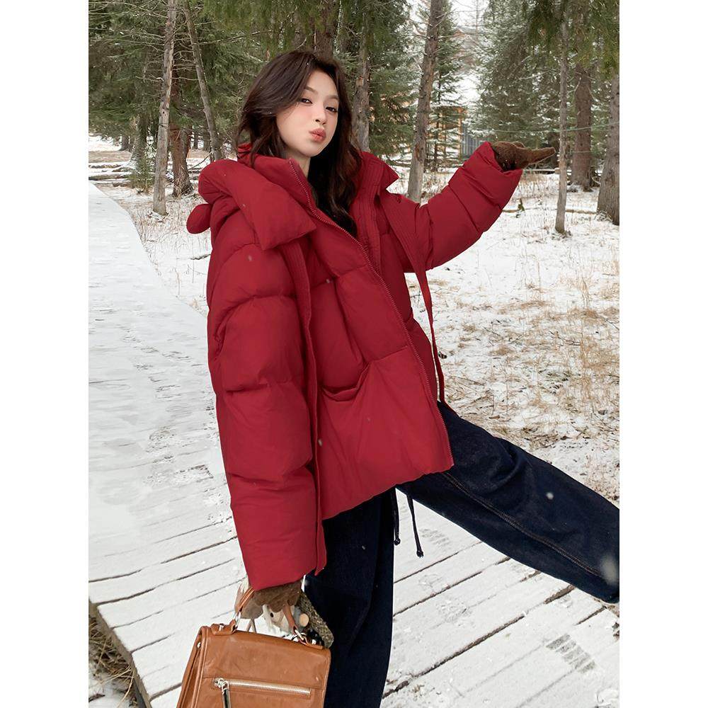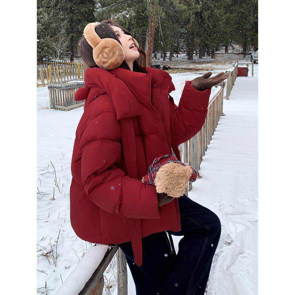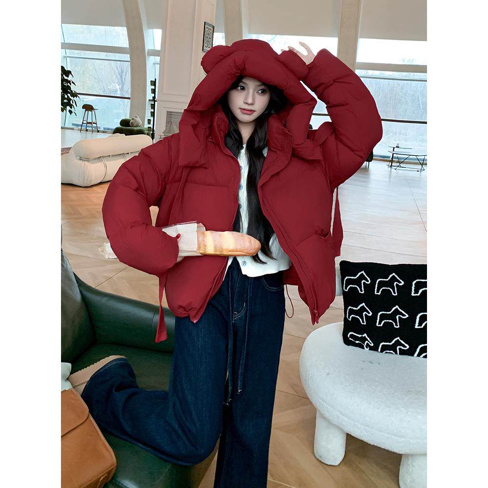 红色立体小熊耳朵俏皮减龄连帽羽绒服女2025冬季新款保暖短面包服