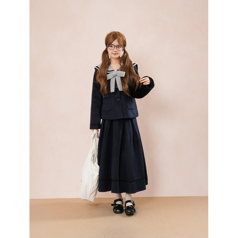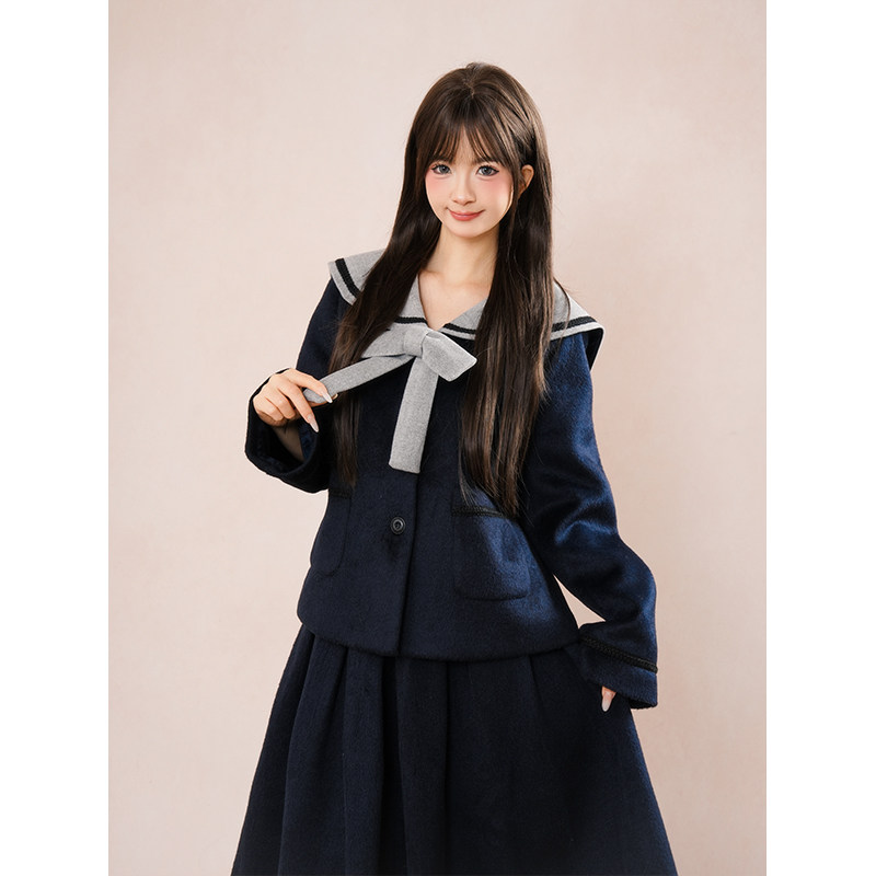 甜美可爱小个子学院风藏青色撞色拼接海军领外套+半身裙两件套女