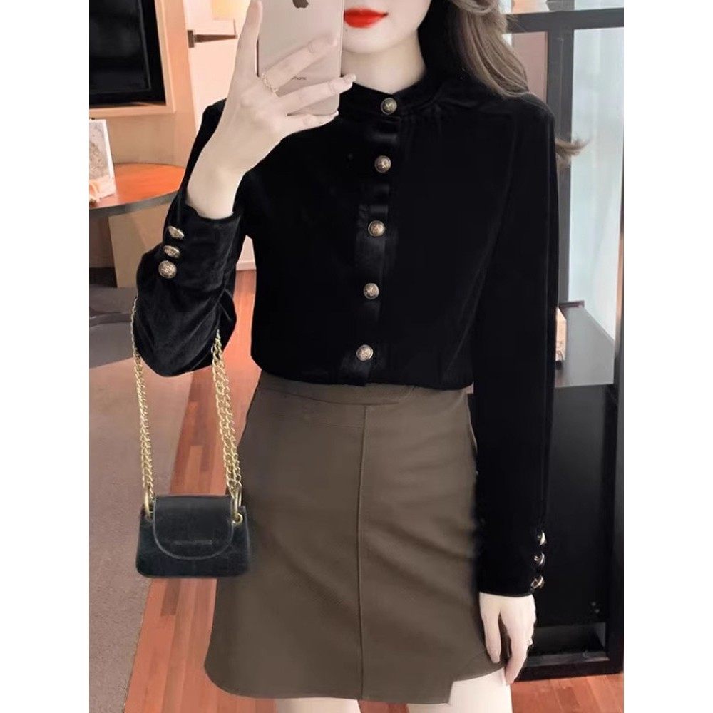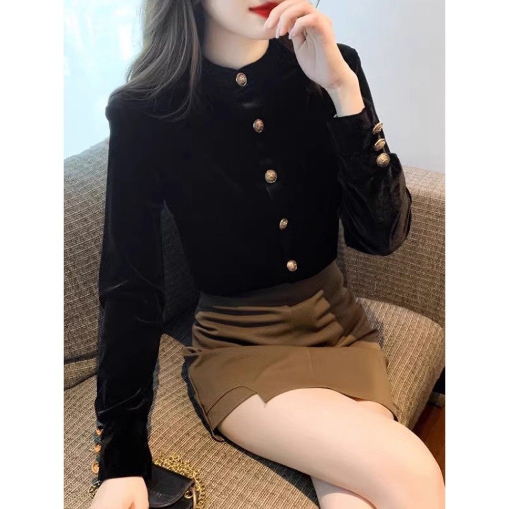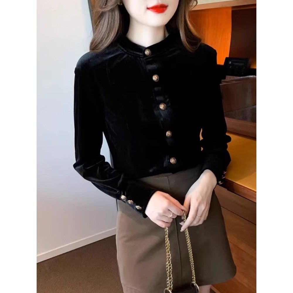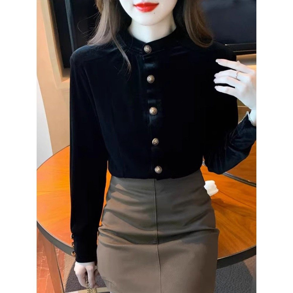 黑色丝绒衬衫女2025春秋新款设计感金属扣时尚气质减龄小立领衬衣